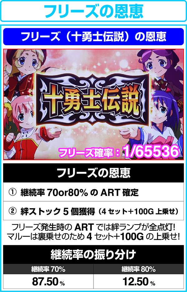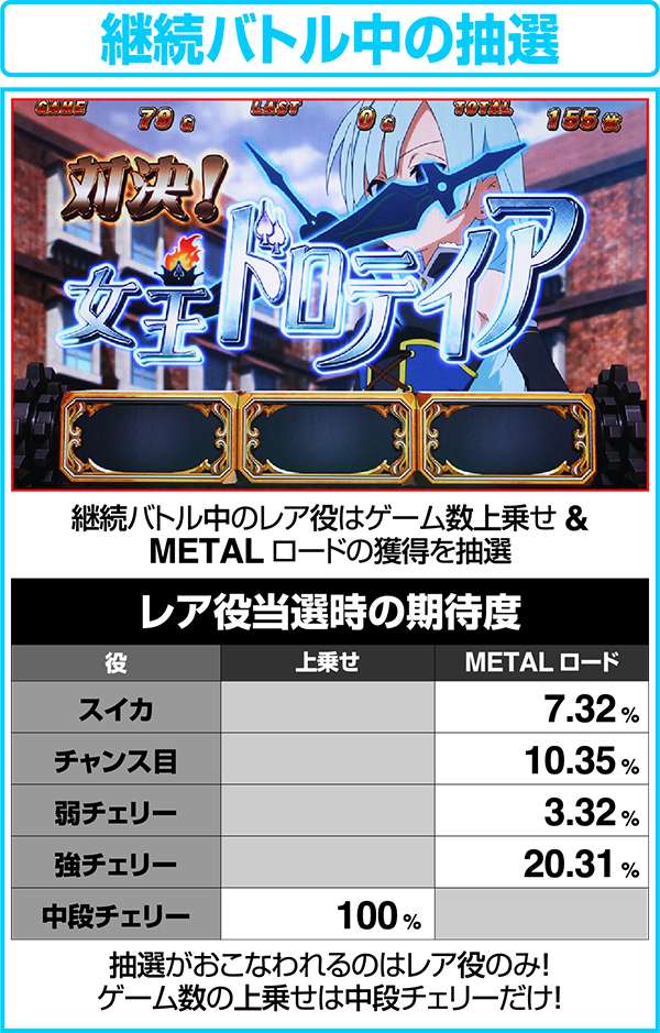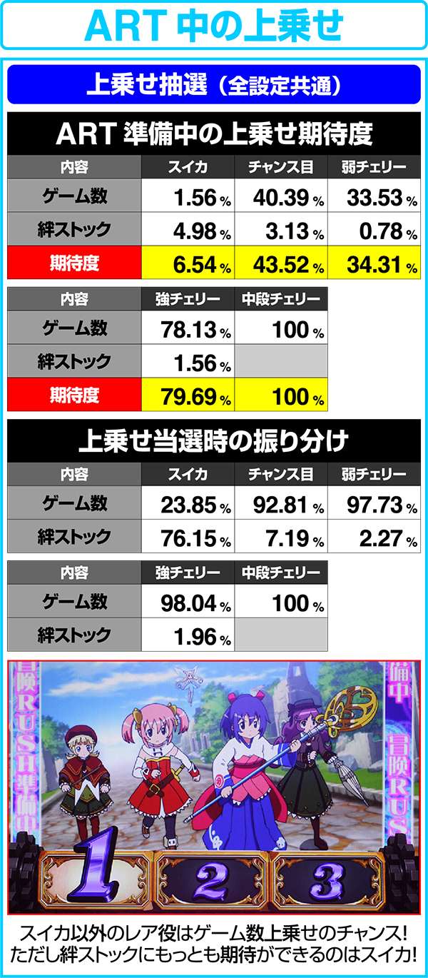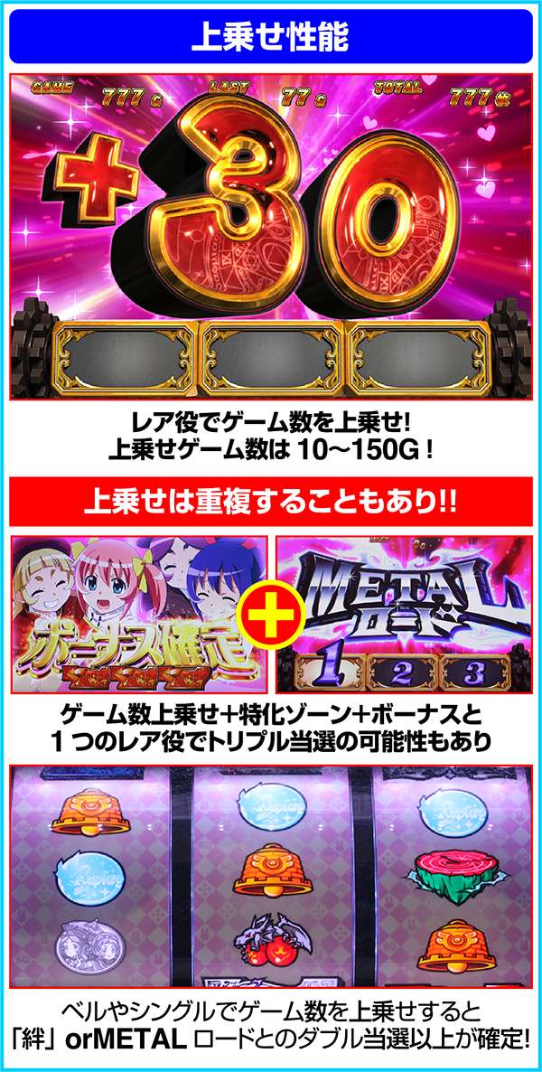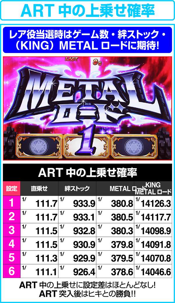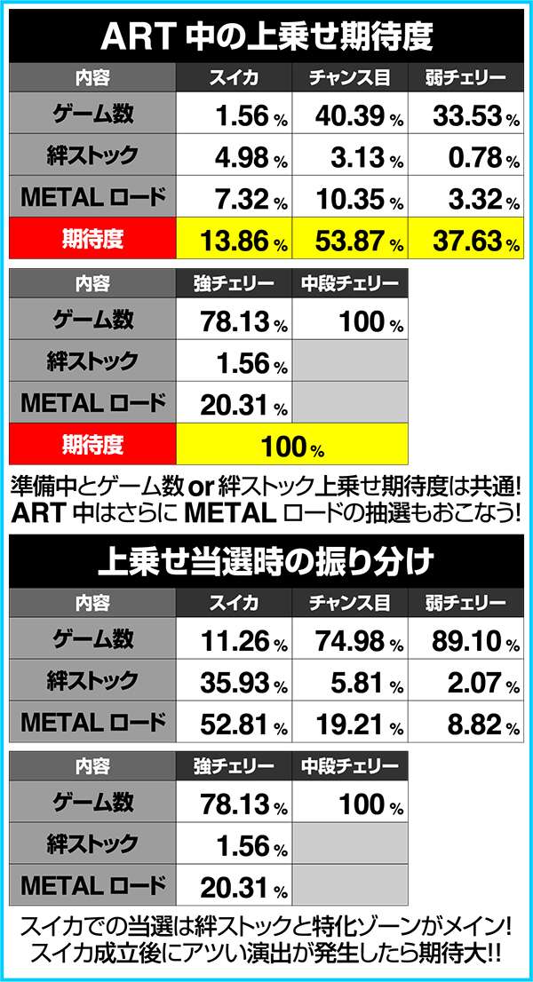 ART準備中とART中は同様の確率でゲーム数および絆ストックの上乗せ抽選をおこなっているが、ART中はゲーム数や絆ストックだけではなく、METALロードの抽選もおこなっているため、トータルの当選期待度はART中のほうが高い。