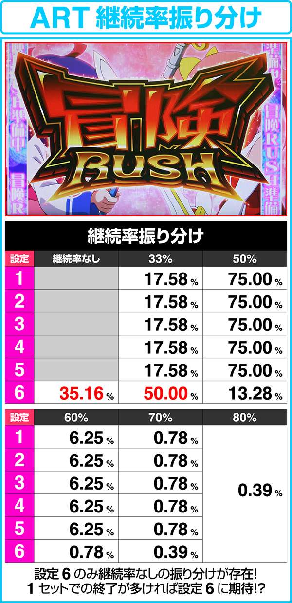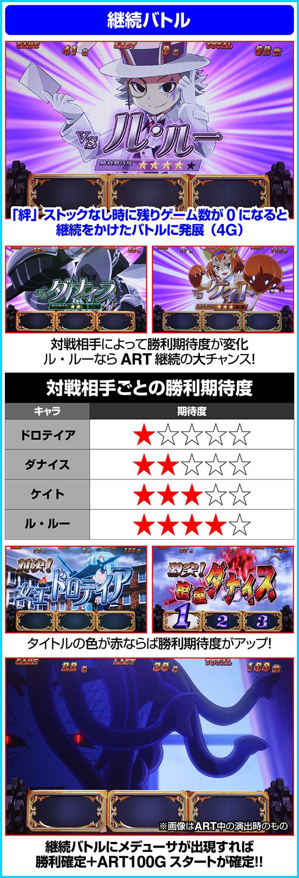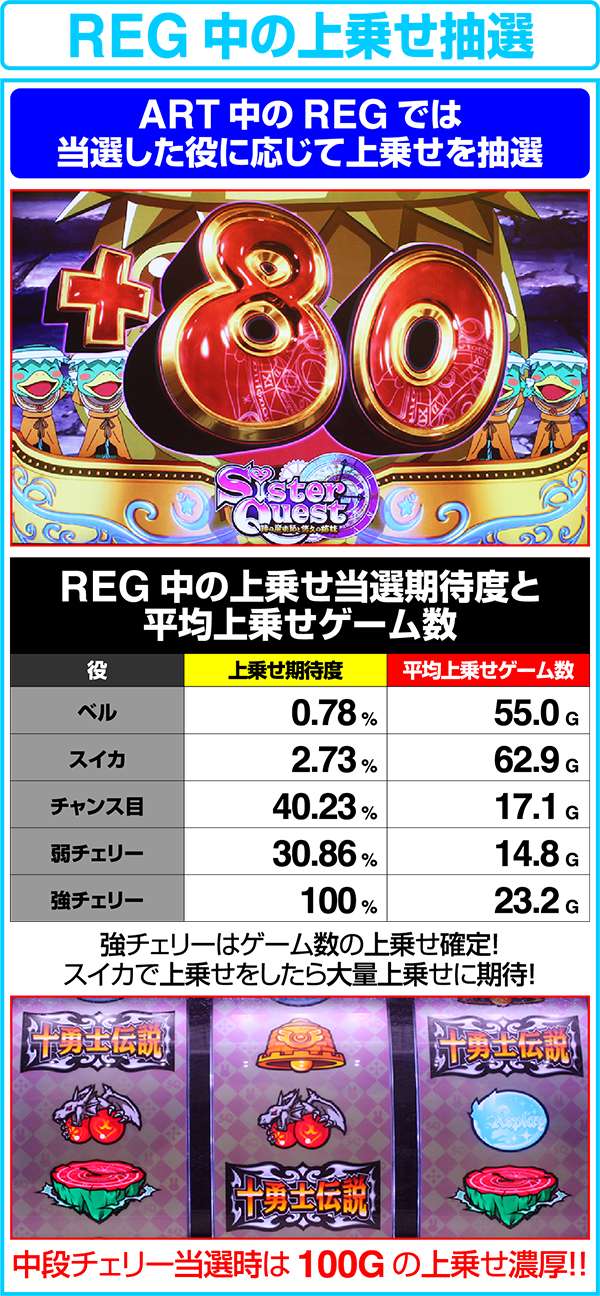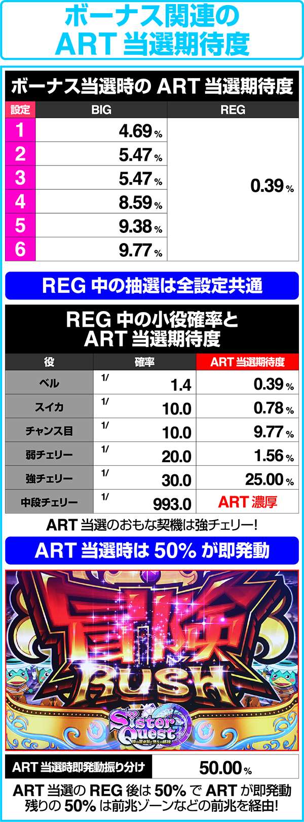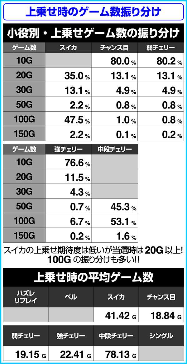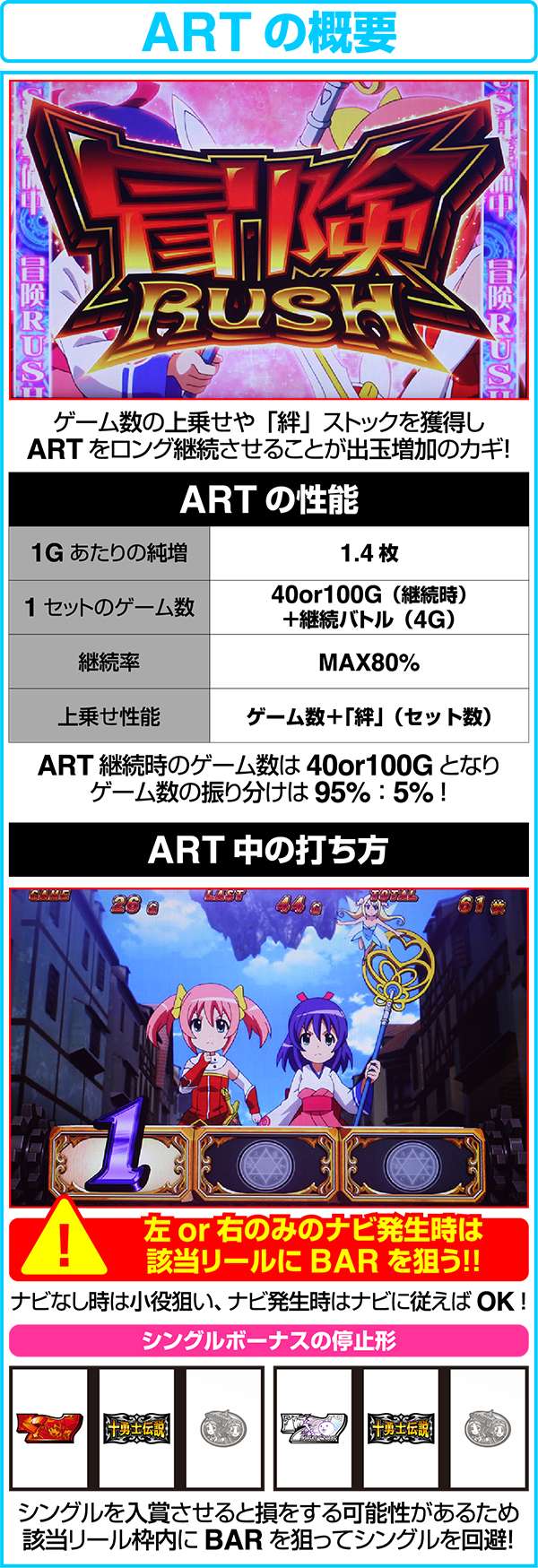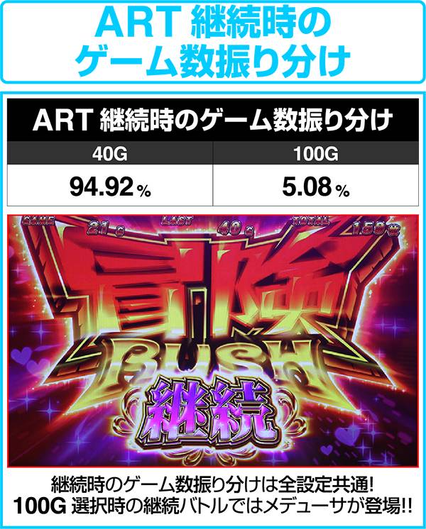通常時はART40G+100G、ART中は発生したセット終了時にプラス100Gとなるが、ART中はボーナスでのゲーム数上乗せもあるため、ほとんど差はない。