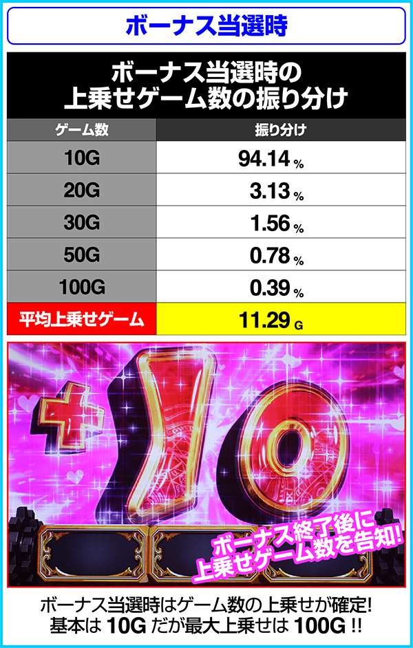 BGM変化のタイミングとしてボーナス終了時に150G以上の上乗せがあるが、ボーナス当選による上乗せは最大で100Gのため、発生のメインはREG中の上乗せ後となりそうだ。