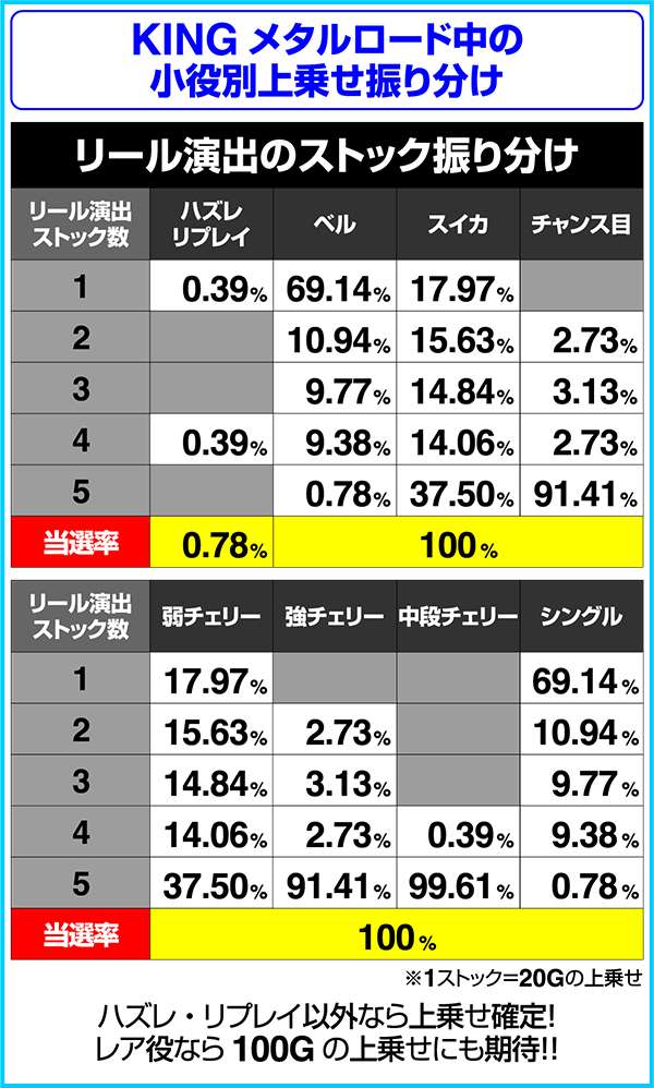 リール演出1つにつき10G(KINGなら20G)の上乗せとなり、最高で100Gになる。レア役は複数のリール演出をストックするため、大量上乗せに期待。