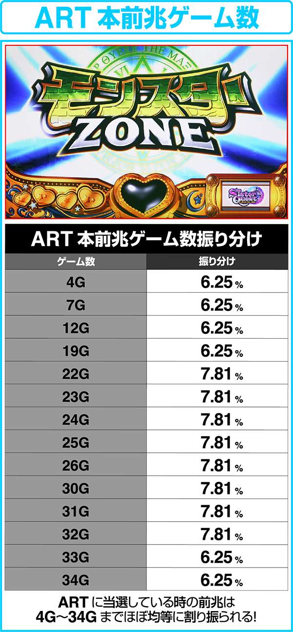 モンスターZONEで、出現するモンスターは全部で21種類となっており、レアなモンスターを倒すほど多くの経験値を獲得=ART当選に期待できる。