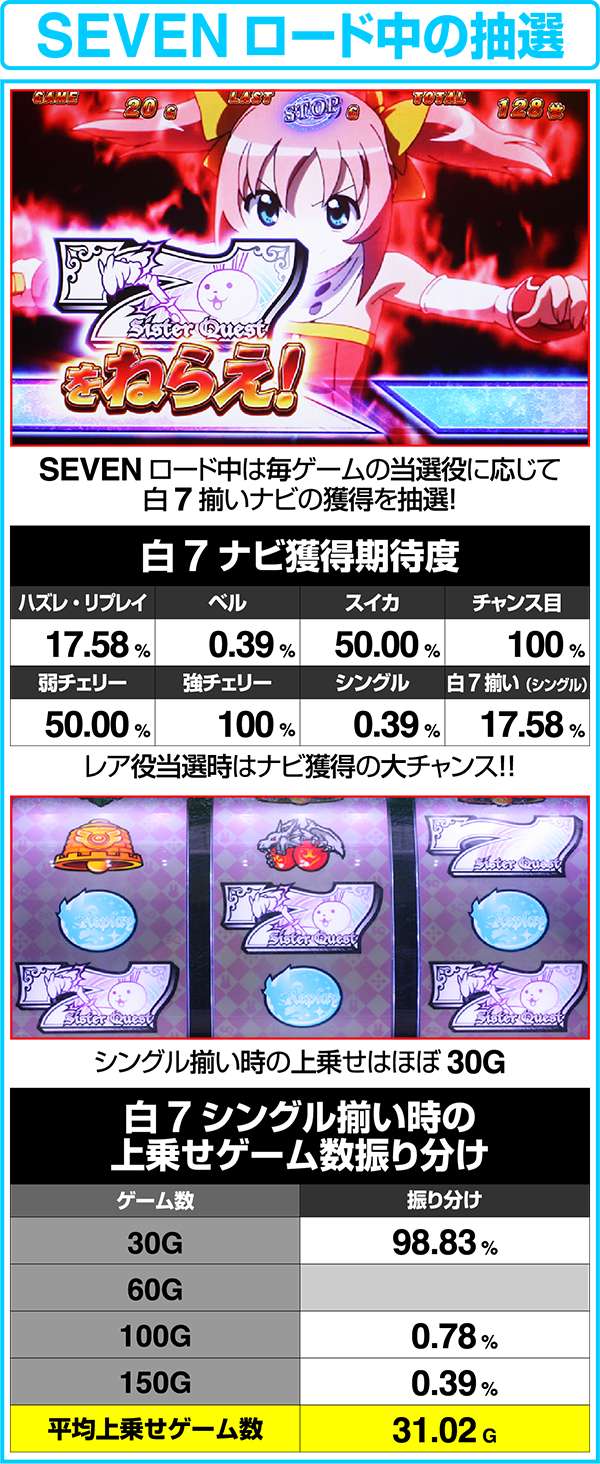 SEVENロードは突入時や消化中のレア役などで獲得したナビがなくなるまで継続する。