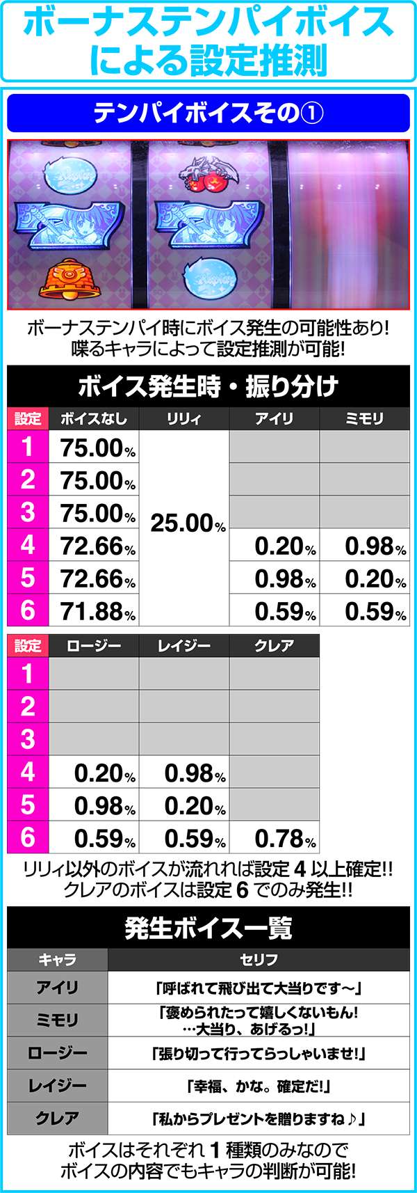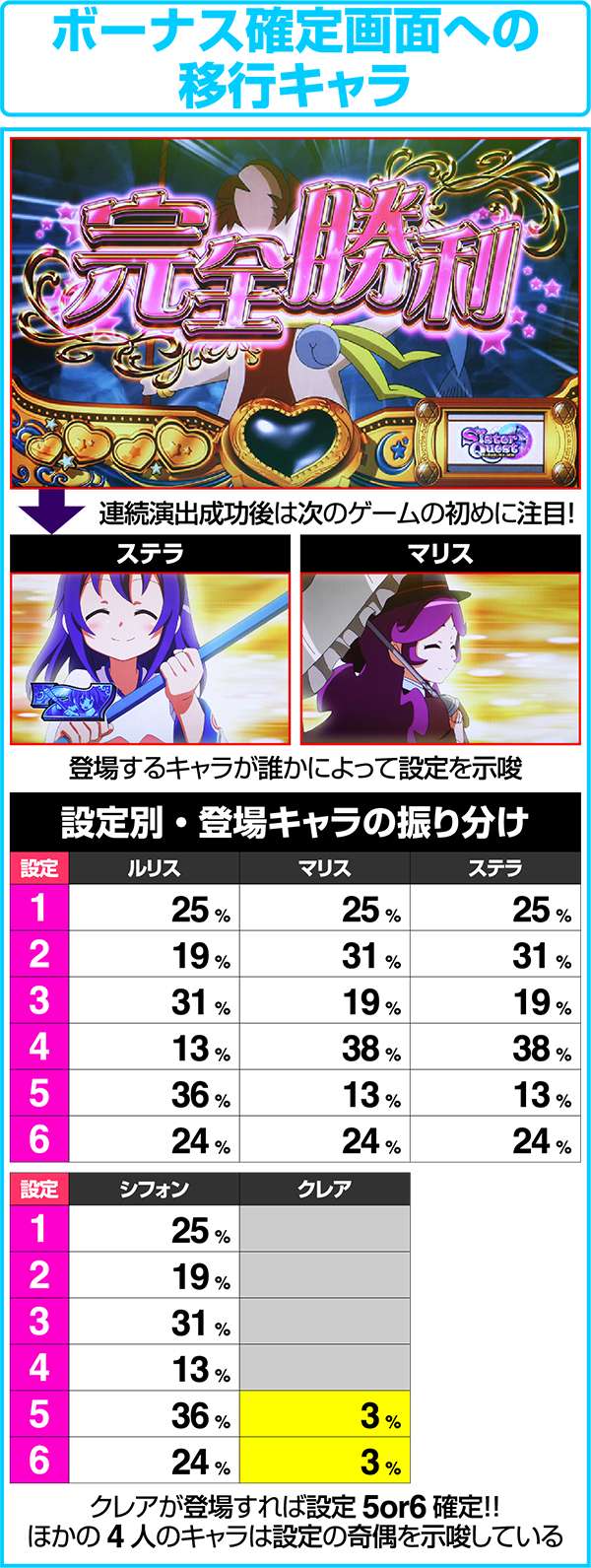 クレアの出現は設定5or6が確定。メインの4キャラは設定の奇偶示唆となり、姉妹の姉は偶数設定、妹は奇数設定で出現しやすい。