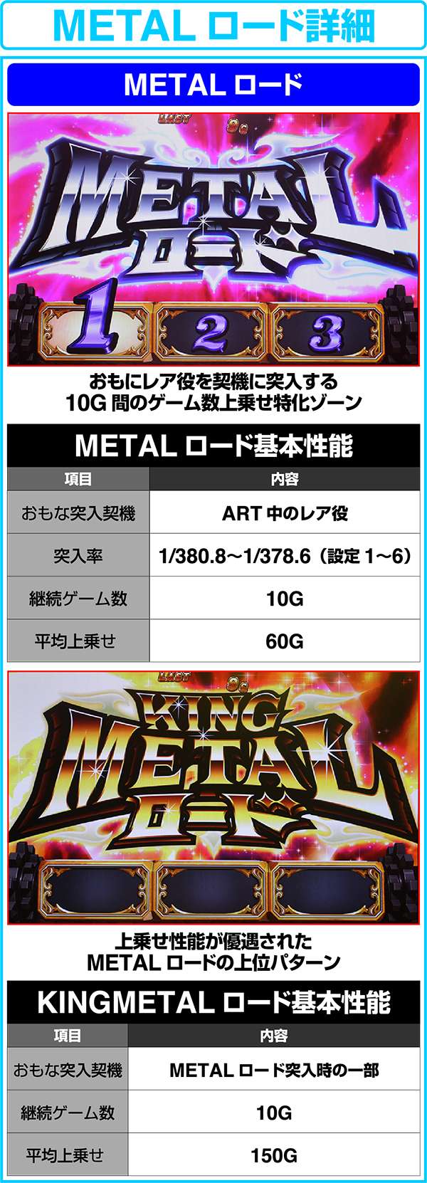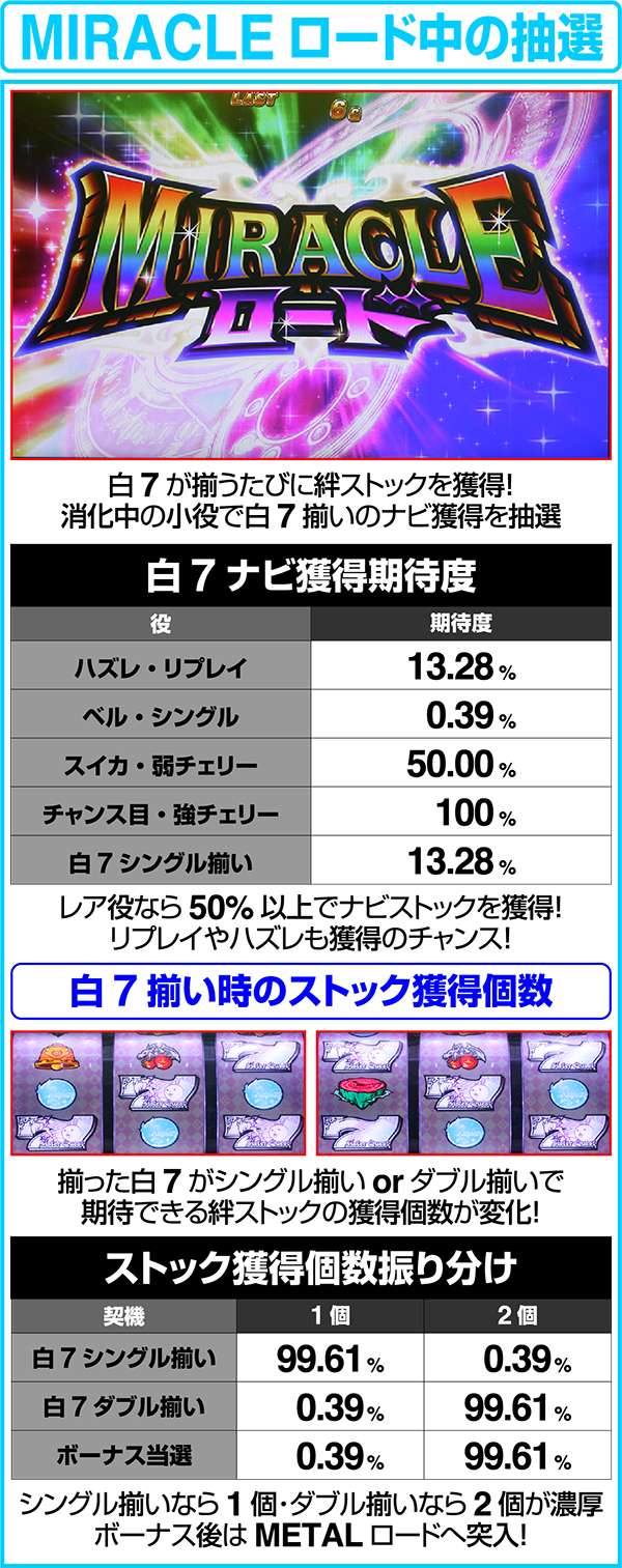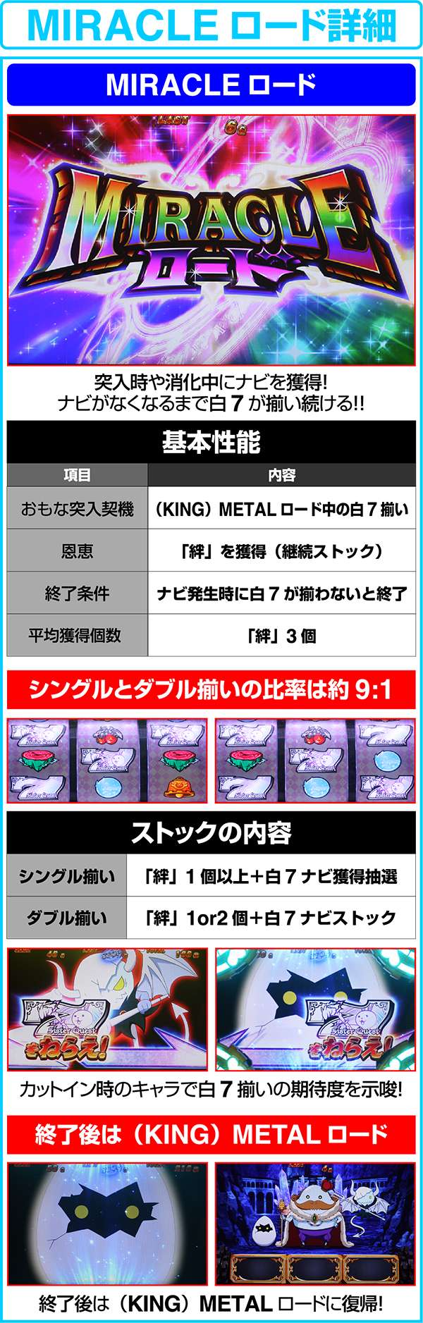 また、MIRACLEロードの前後は(KING)METALロードの可能性が高いため、突入時は大量の上乗せゲーム数を獲得できるポイントと言えよう。