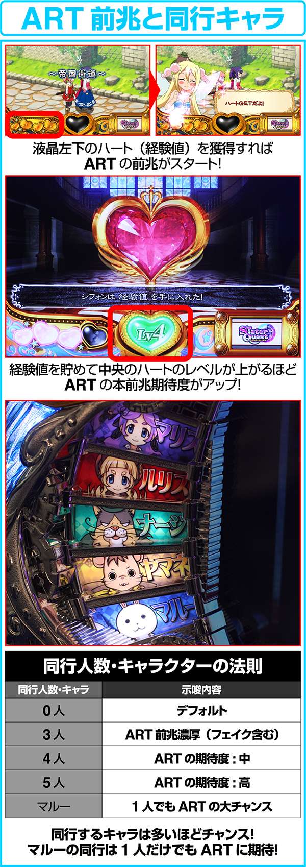 通常時のレア役成立後などにキャラが仲間に加われば前兆開始の合図となり、人数が増えるほどARTの期待度がアップする。