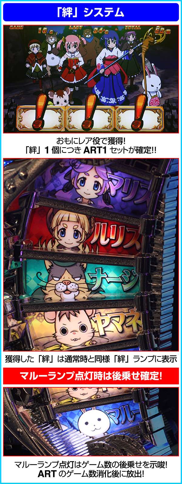 ART中にはマリス、ルリス、ナージ、ヤマネのほかにマルーのランプが点灯する可能性もあり、点灯時は「絆」ストックではなく、ゲーム数の後乗せが確定。