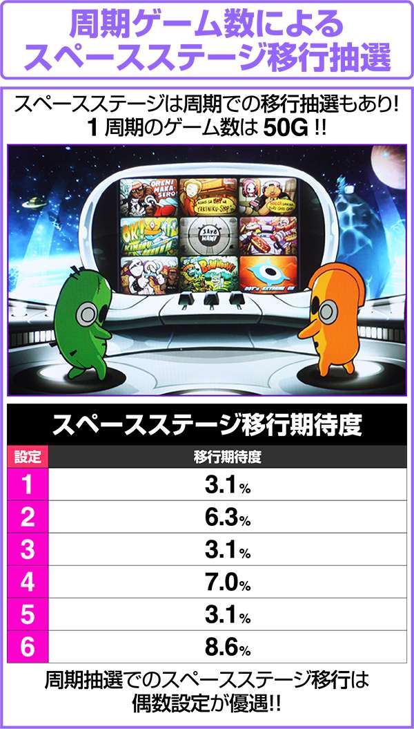 スペースステージ移行時は連続演出への発展期待度が大幅にアップ。レア役だけではなく、全役で抽選をおこなっているため、スペースステージではいつもより気合を入れてレバーを叩きたい。