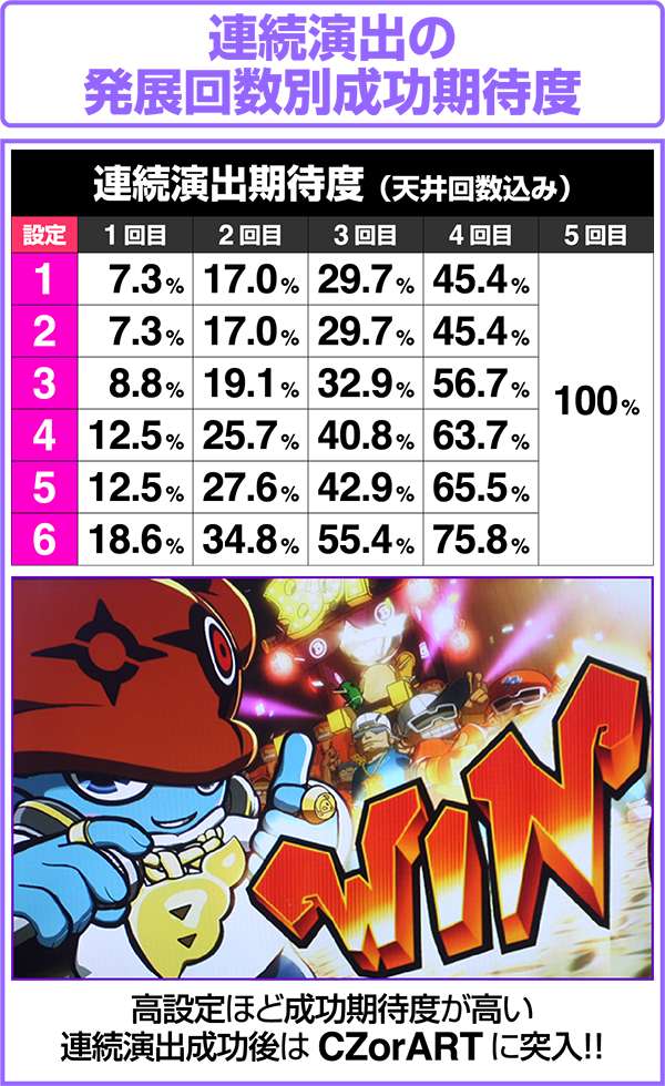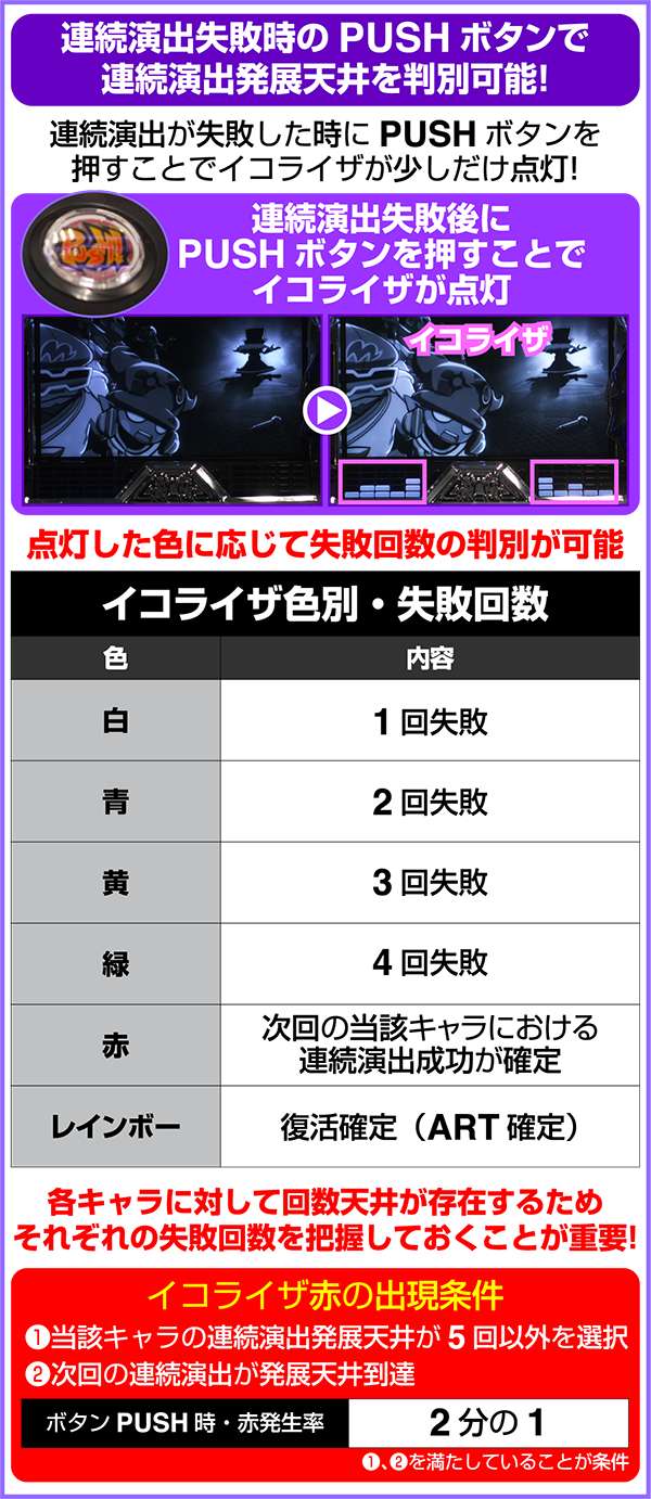 連続演出失敗時に当該キャラが何回連続演出を失敗したかはボタンPUSHにより判別が可能。当該キャラが天井に到達しても、リセット条件を満たさないかぎり、他のキャラの天井回数はリセットされないため、失敗回数を把握しておくことが重要となる。