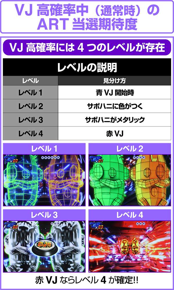 VJ高確率のレベルは見た目で判別ができる。1〜3のときはサボハニの色によってレベルを示唆。背景の色が赤なら問答無用でレベル4が確定となる。
