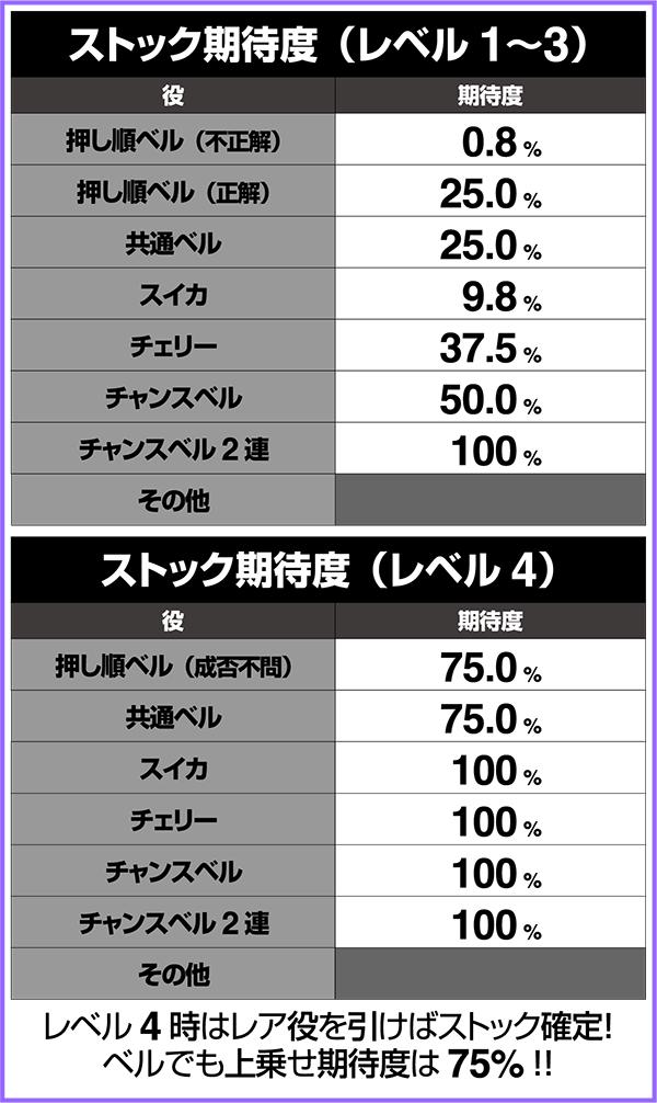 レベル3の時にストックを獲得すればVJ高確率のゲーム数を上乗せするチャンス。さらに、VJ高確率のレベルが4へアップするため、大量ストックにも期待ができる。