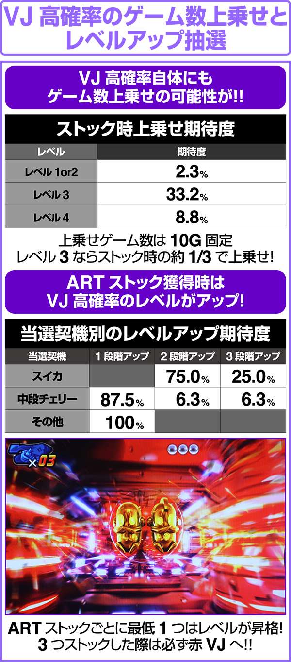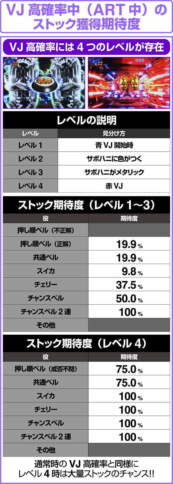 VJ高確率でのARTストック時には、VJ高確率自体のゲーム数上乗せおよびVJ高確率のレベルアップ抽選もおこなわれる。