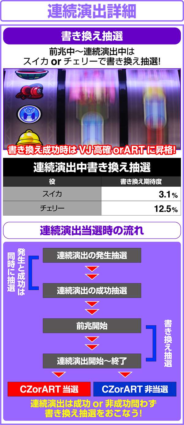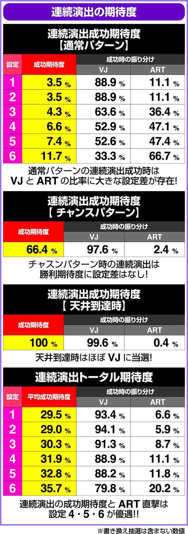 内部的に連続演出成功だった場合も書き換え抽選をおこなっており、VJ高確だった場合は、ART直撃への書き換え抽選がおこなわれる。