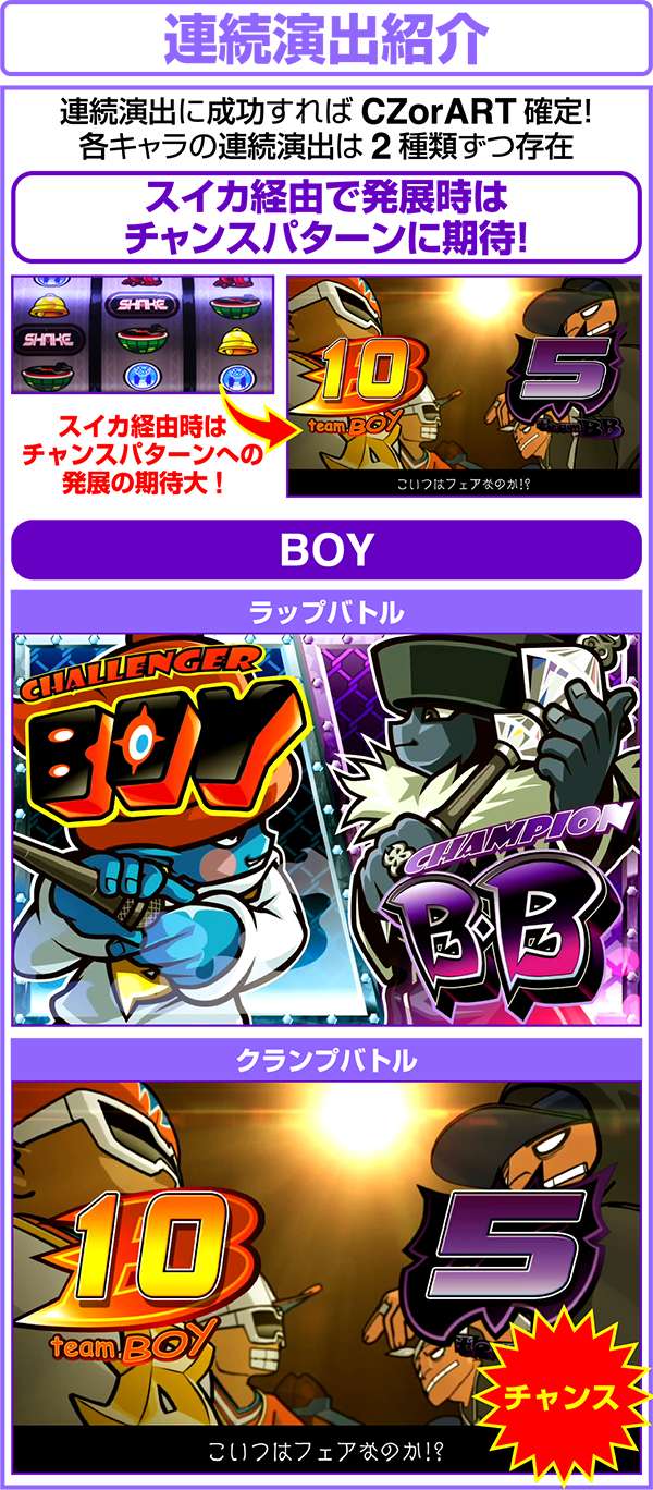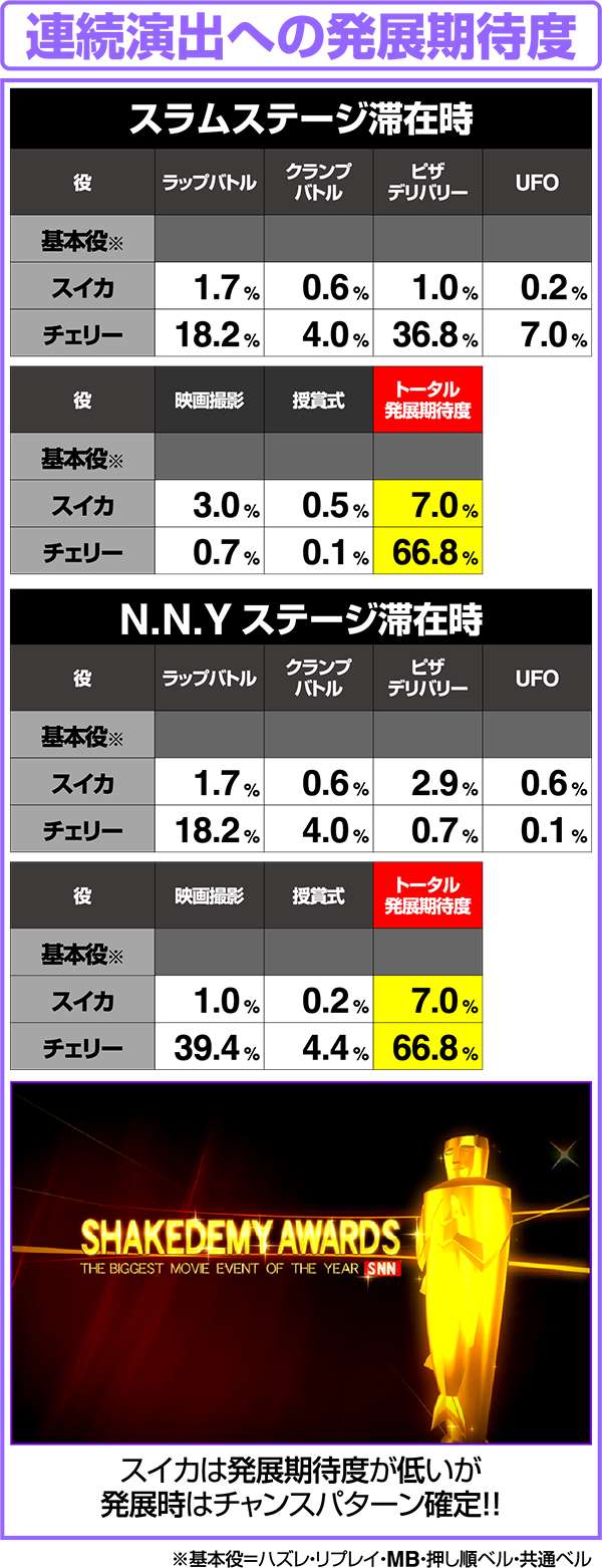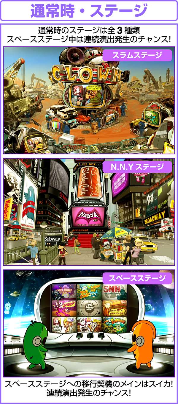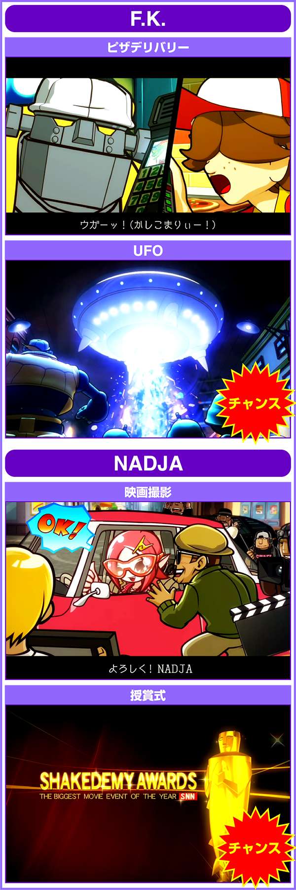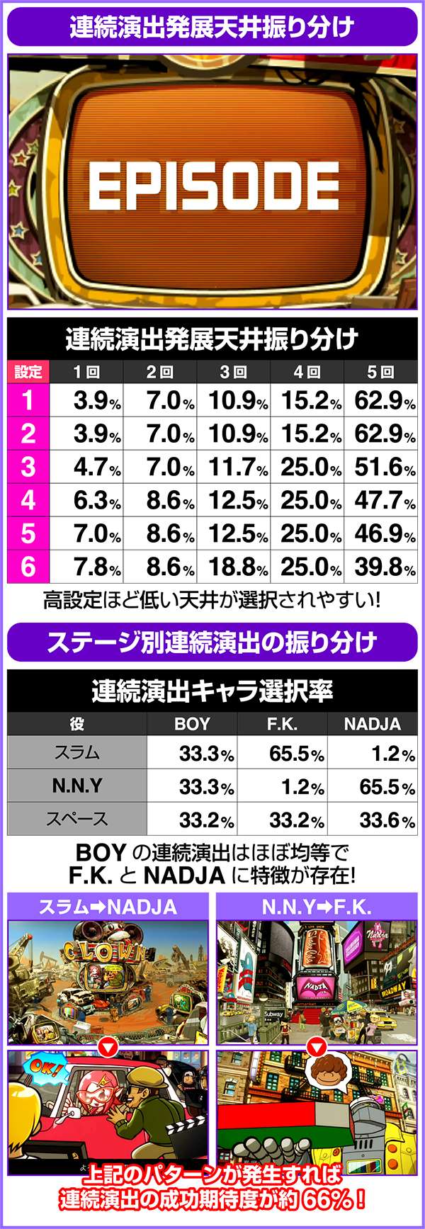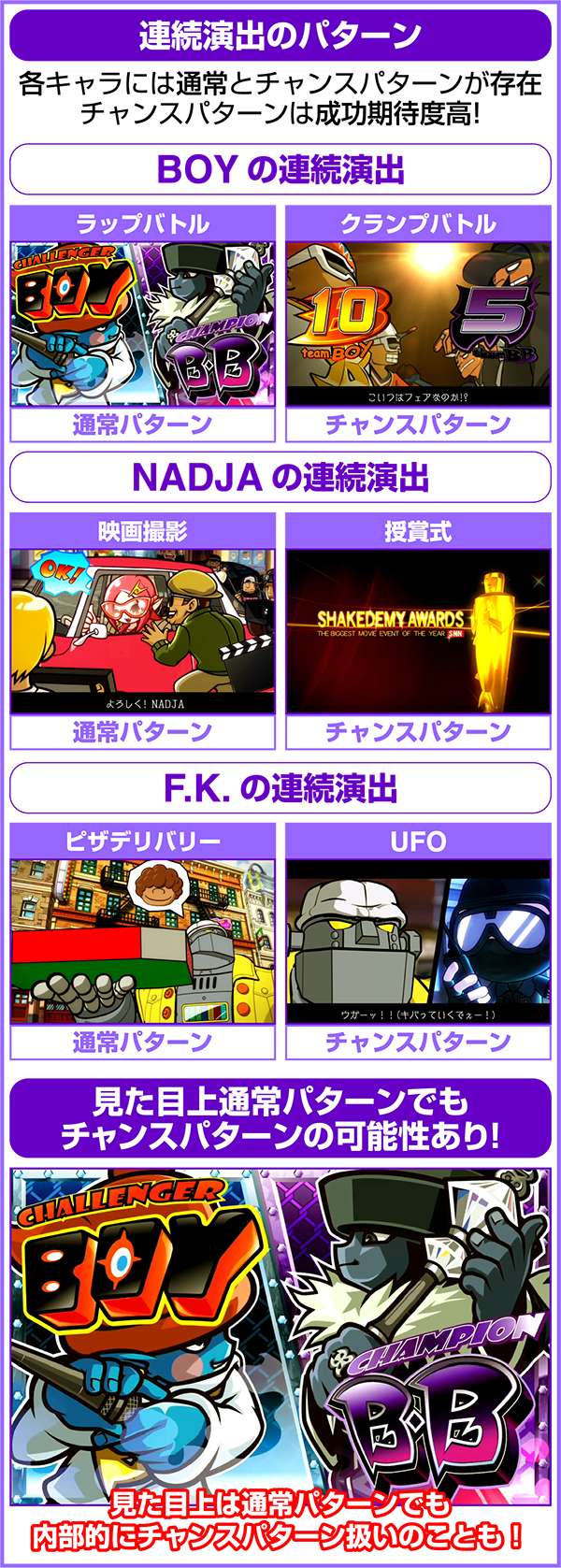 スラムステージはF.K.orBOYの連続演出に発展しやすく、N.N.YステージならNADJAorBOYの連続演出に発展しやすいといった特徴がある。