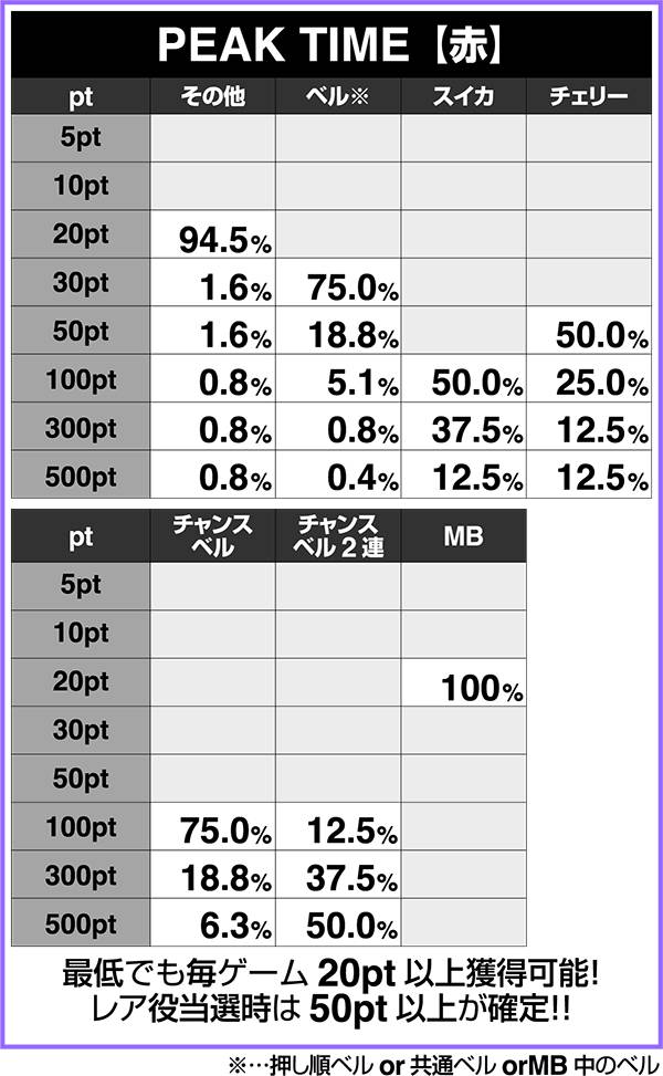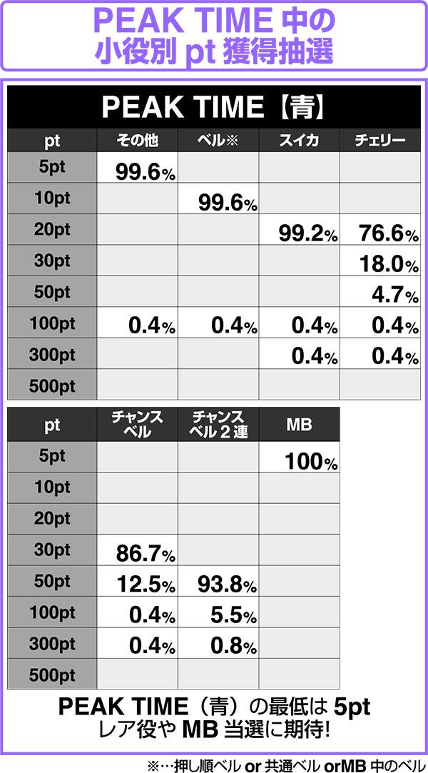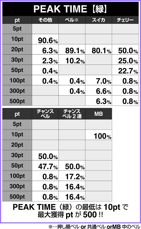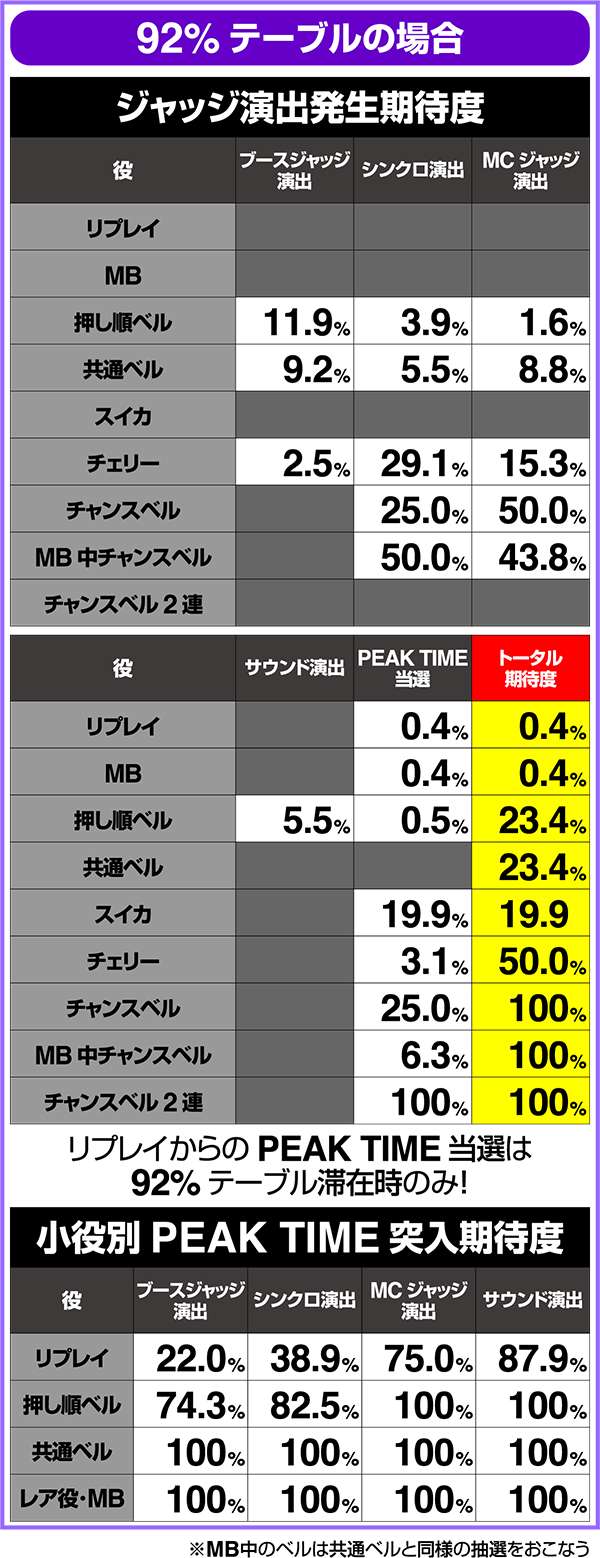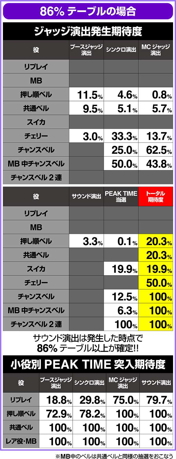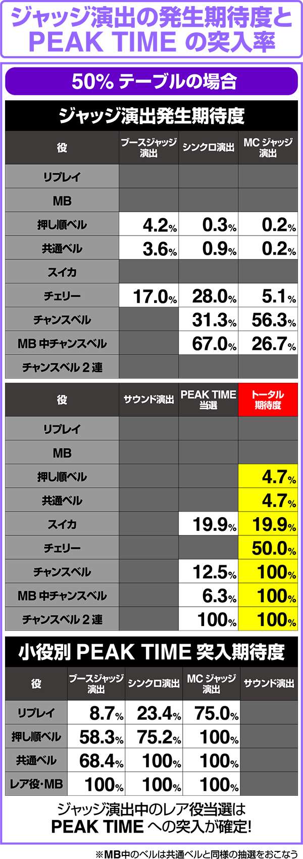 小役ごとのジャッジ演出期待度とPEAK TIME 突入率