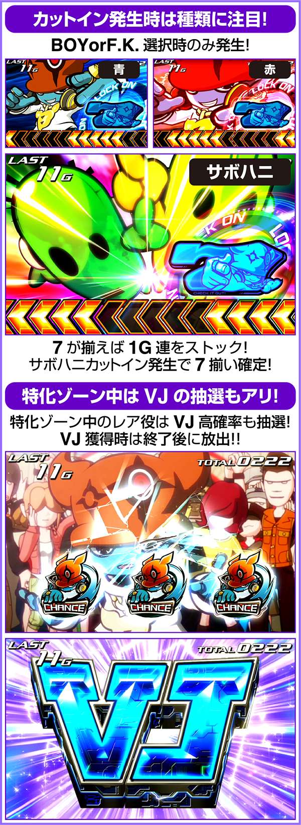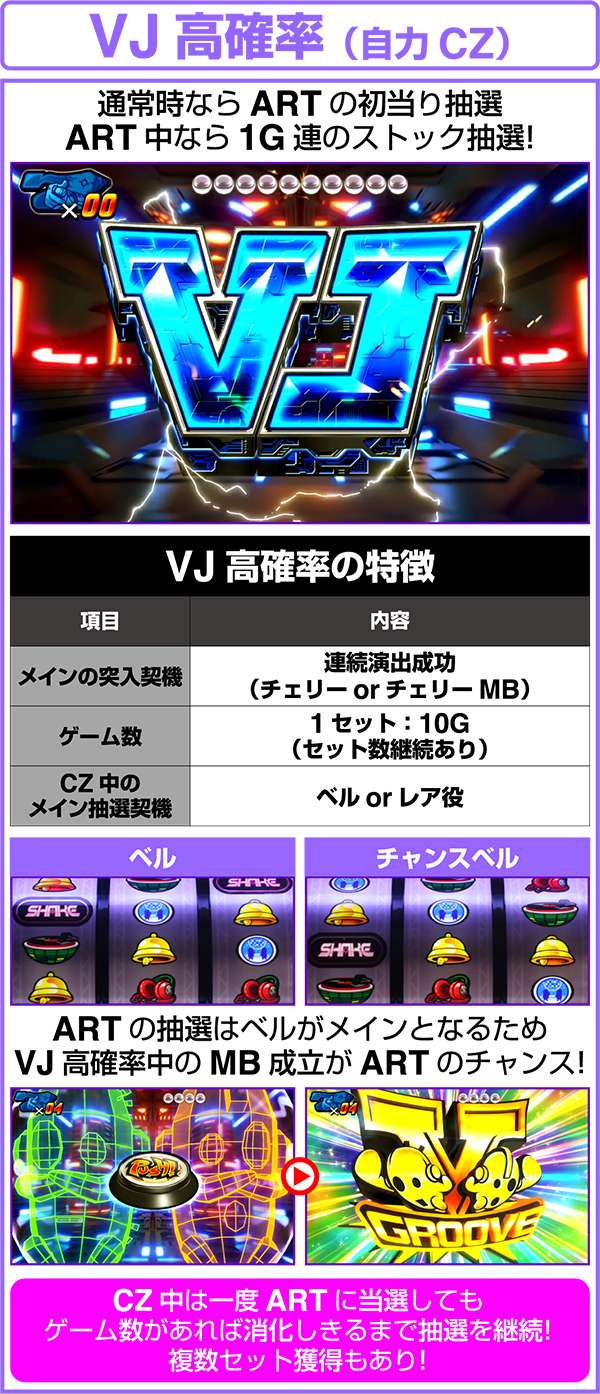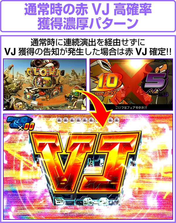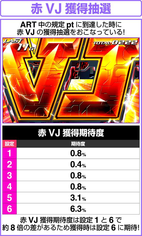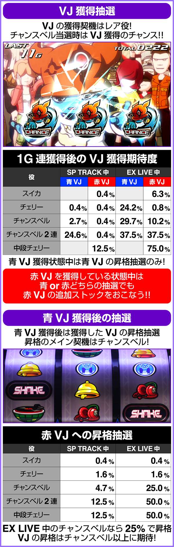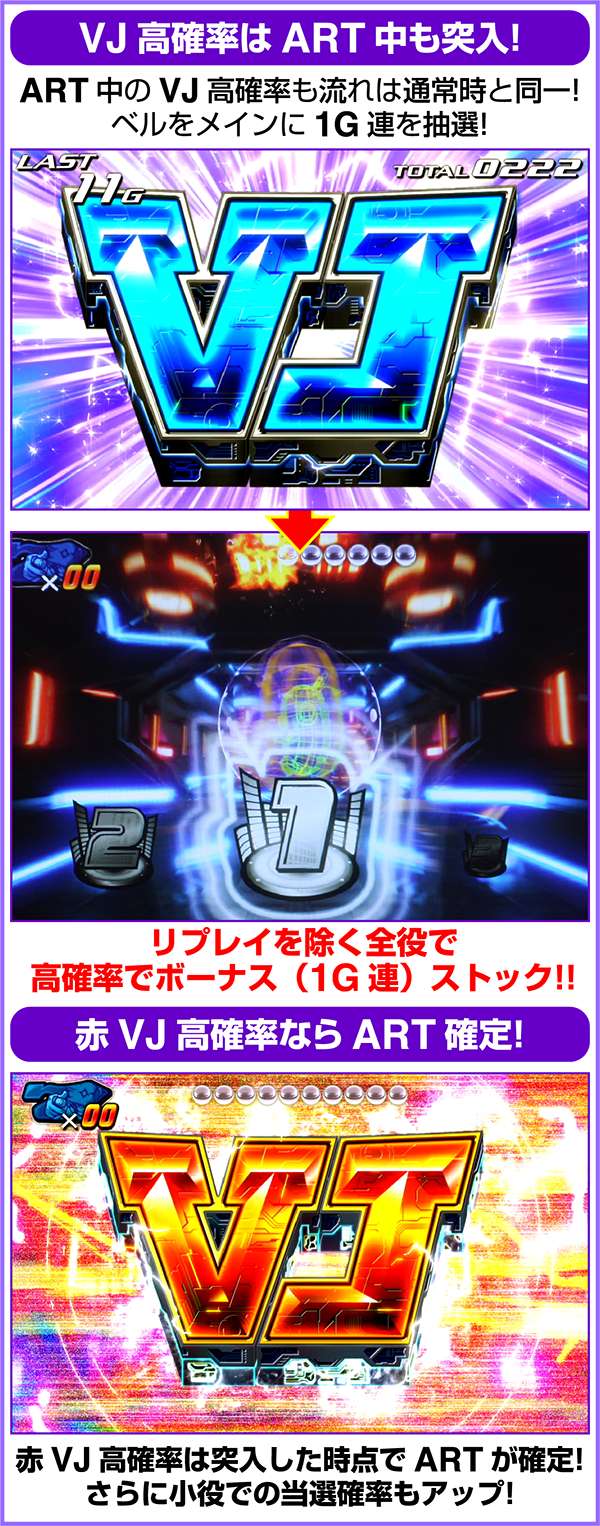 また、VJ獲得抽選はレア役でおこなっており、青VJ獲得後は昇格に期待できる。さらに、赤VJ獲得後はVJ獲得抽選に当選=赤VJ獲得となるので大量出玉獲得の大チャンスとなる。