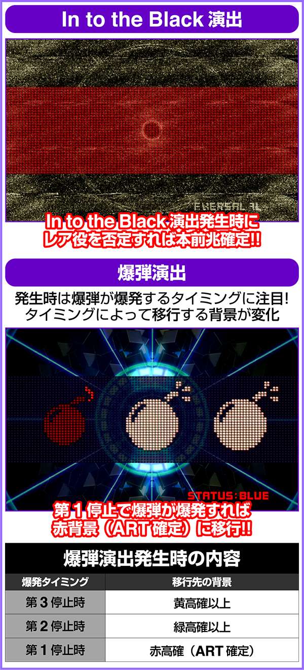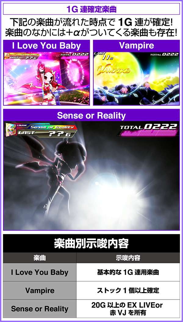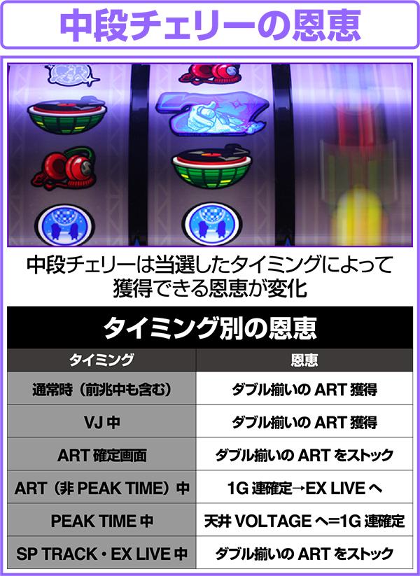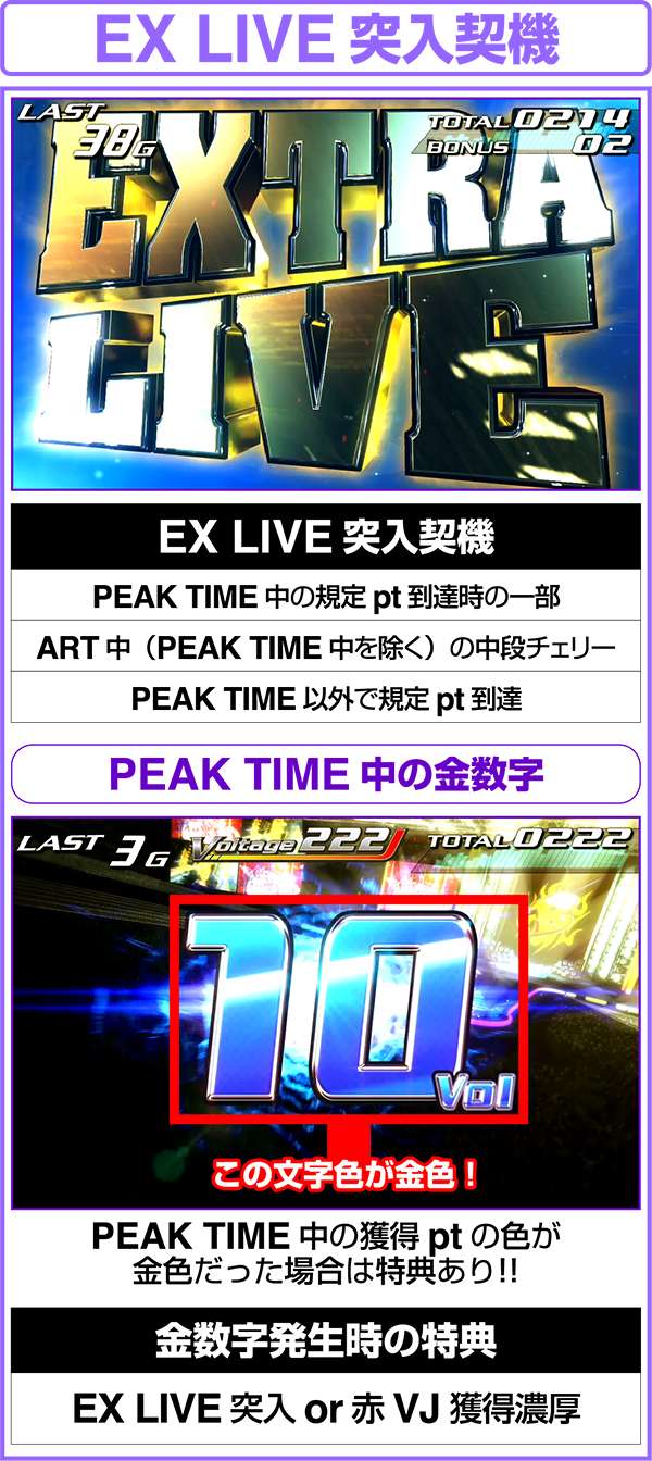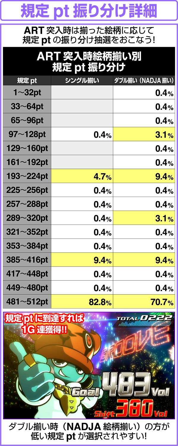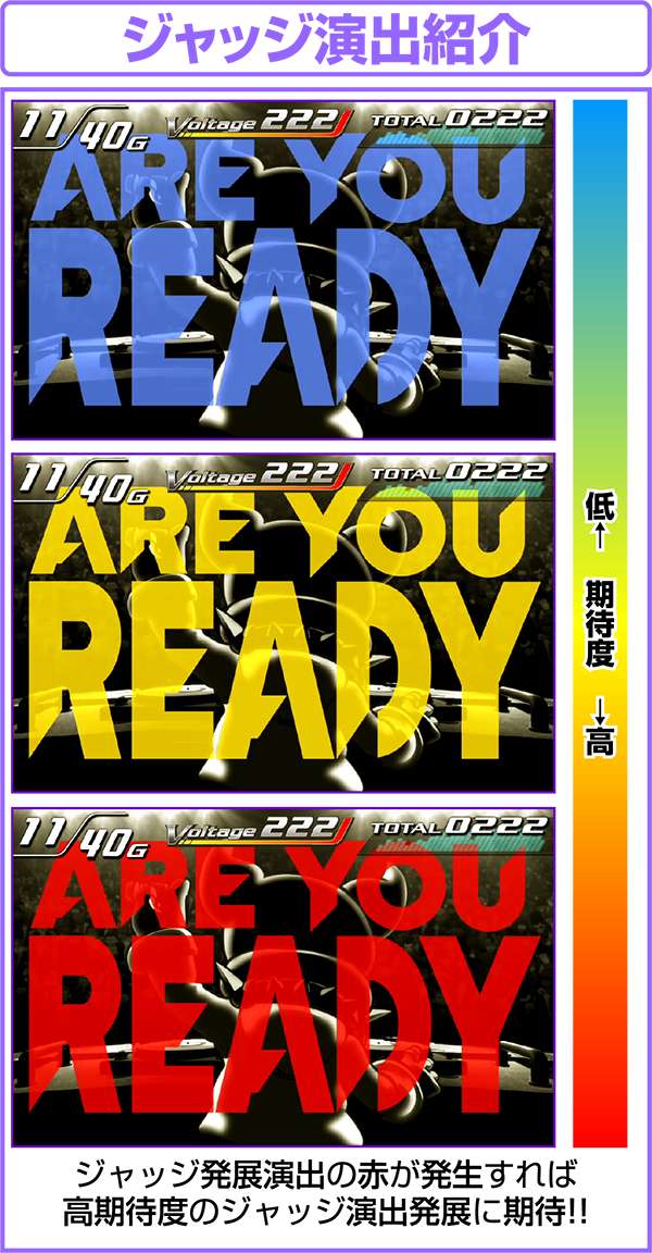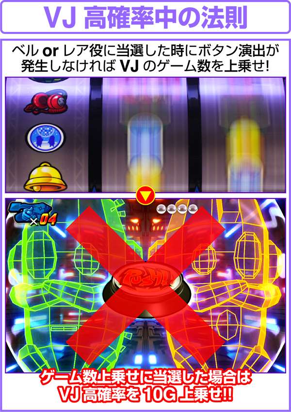 また、VJ獲得抽選はレア役でおこなっており、青VJ獲得後は昇格に期待できる。さらに、赤VJ獲得後はVJ獲得抽選に当選=赤VJ獲得となるので大量出玉獲得の大チャンスとなる。