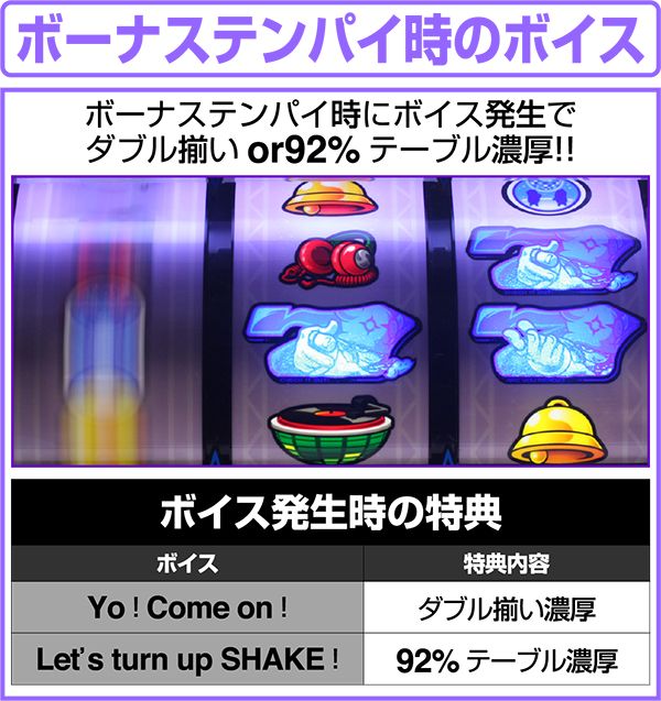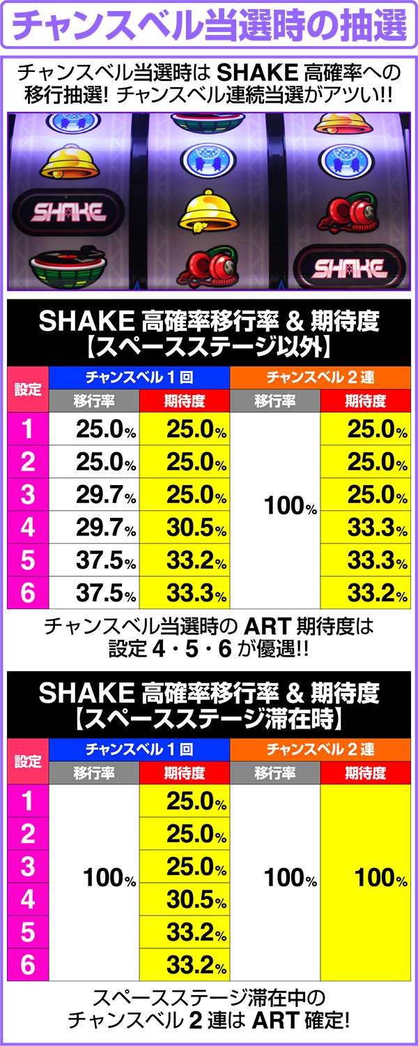 突入期待度はシングル揃い時よりもダブル揃い時の方が優遇されており、PEAK TIMEへの突入が1回以下ならSHAKE高確率への突入が確定。