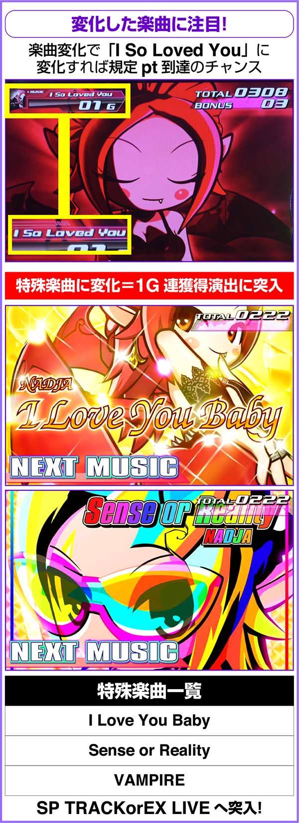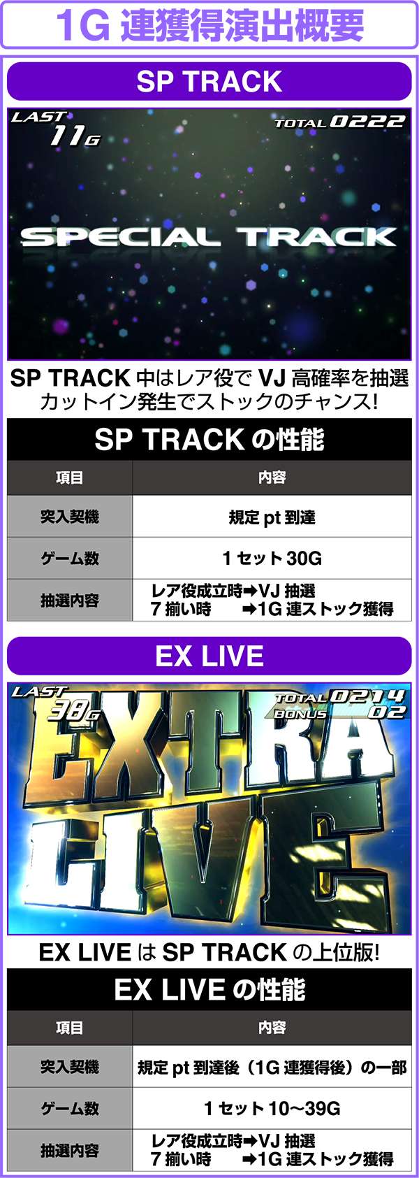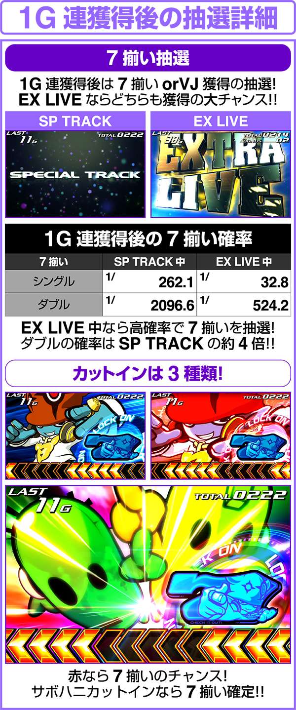 1G連獲得後はSP TRACKorEX LIVEのどちらかに突入。突入後は7揃いorVJ獲得の抽選をおこなう。7揃いはカットイン発生でチャンスとなり、赤やサボハニカットインといったチャンスアップパターンが存在。