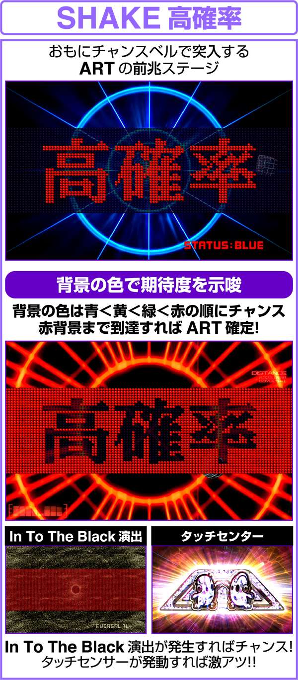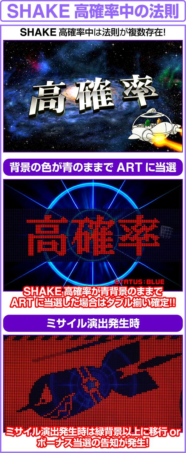 SHAKEシリーズでおなじみの高確率は、今作でも前兆演出となっている。演出発生時に背景の色が変わることがあり、赤まで到達すればARTが確定する。