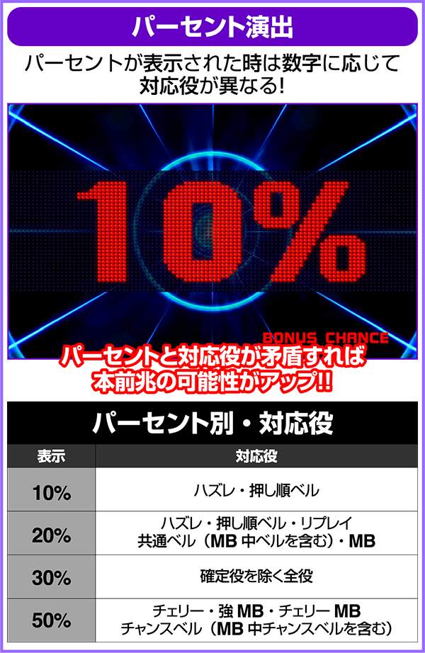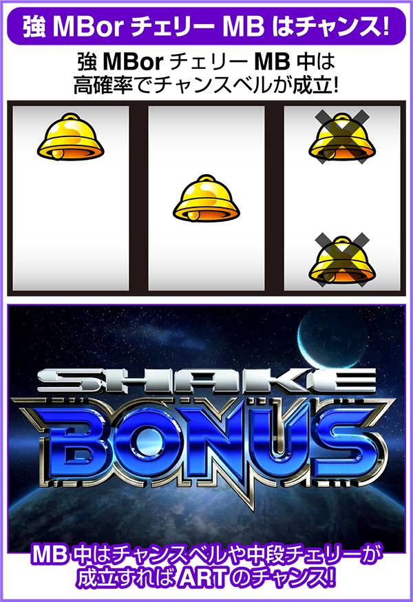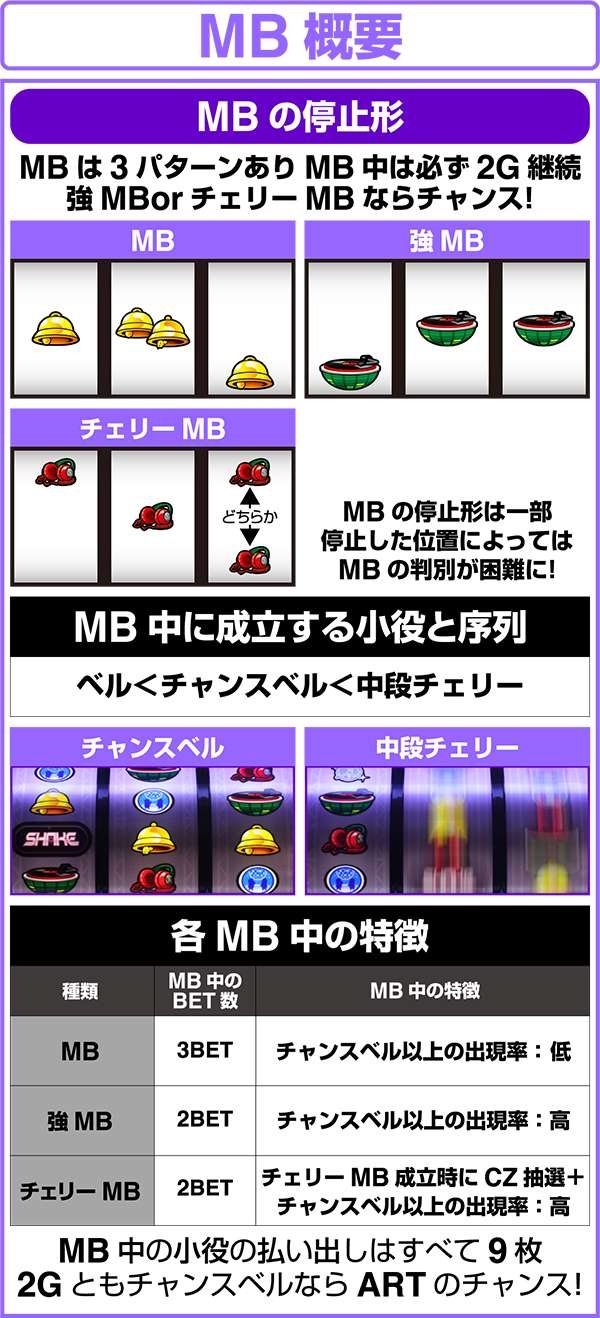 MBは3パターンあり、序列はMB<強MB<チェリーMB。MB中はチャンスベルや中段チェリーなども成立するため、ART当選のチャンス。