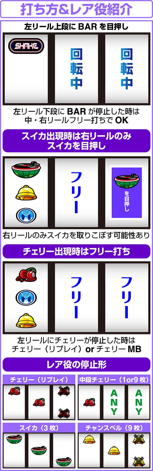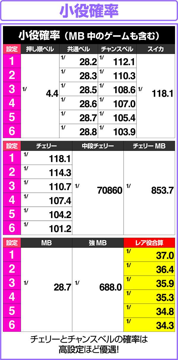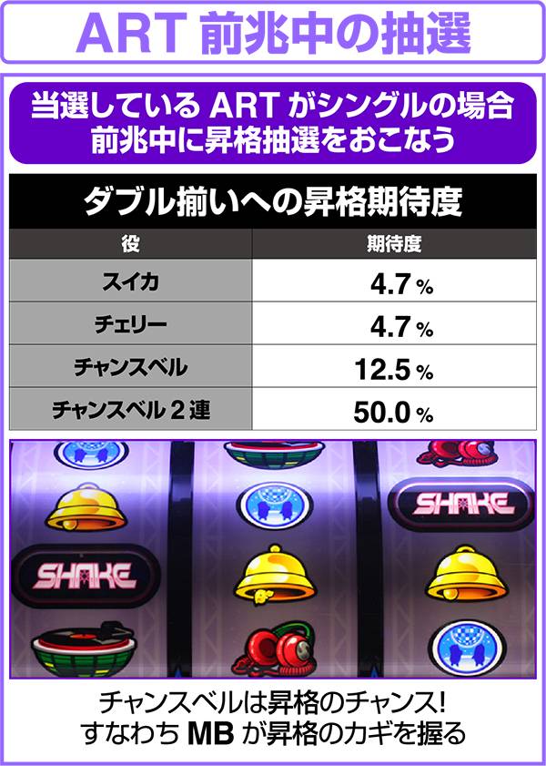 チェリーMBと強MB中はチャンスベル確率が大幅にアップしている。連続演出中など、ARTの本前兆に期待ができる場合に成立したらダブル揃いへの昇格を祈ろう。