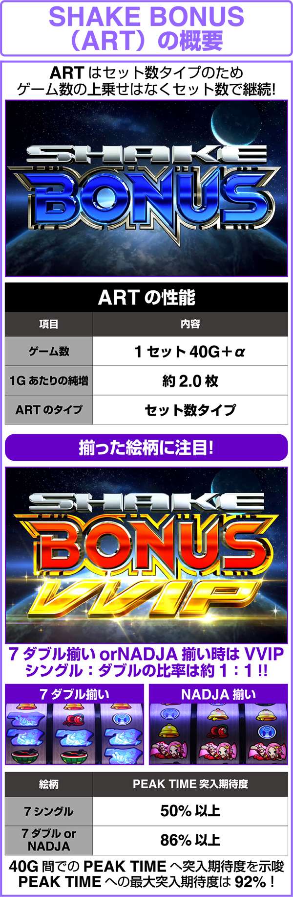 「SHAKEⅡ」から約10年の時を経て、ART機となり登場。 本機はARTの「SHAKE BONUS」(純増約2枚・1セット40G+α)を1G連させながら出玉を増加させていくゲーム性となっている。ART中にVOLTAGEを溜めMAXにすれば、ARTストックなどのチャンスとなるSPECIL TRACKorEXTRA LIVEに突入するなど、特化ゾーンも装備。 専用筐体が奏でるリアルサウンドも注目!! |