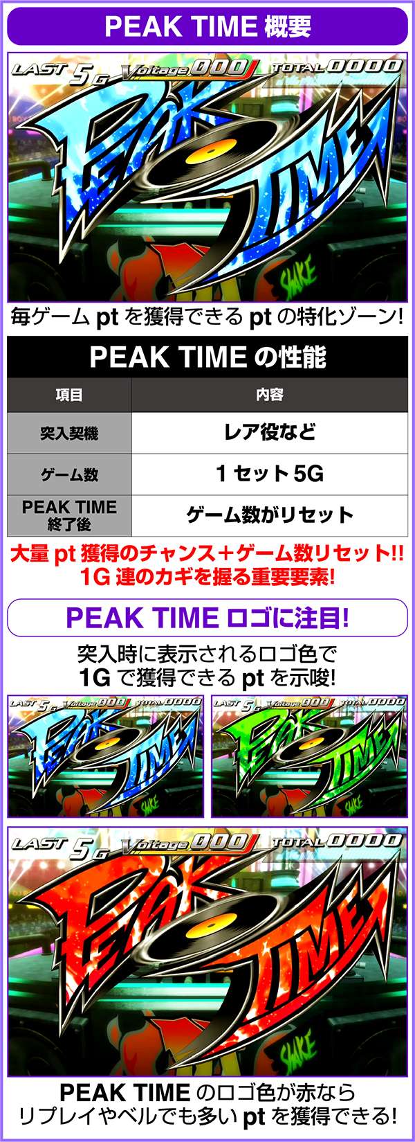 ART突入時に揃う絵柄によって、ゲーム数リセットかつ1G連のカギを握るptの特化ゾーンであるPEAK TIME突入期待度も変化。