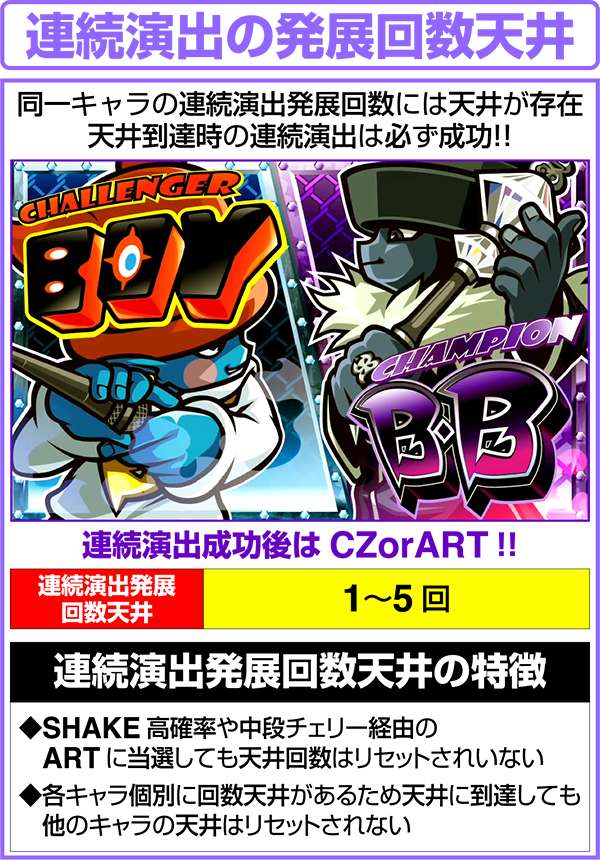 本機の連続演出は一般的な連続演出とは異なり、天井回数が設けられている。連続演出の強弱は不問で、最大天井は各キャラごとに5回。