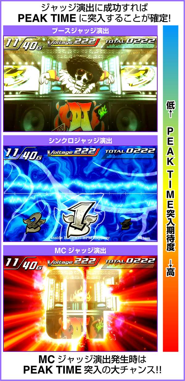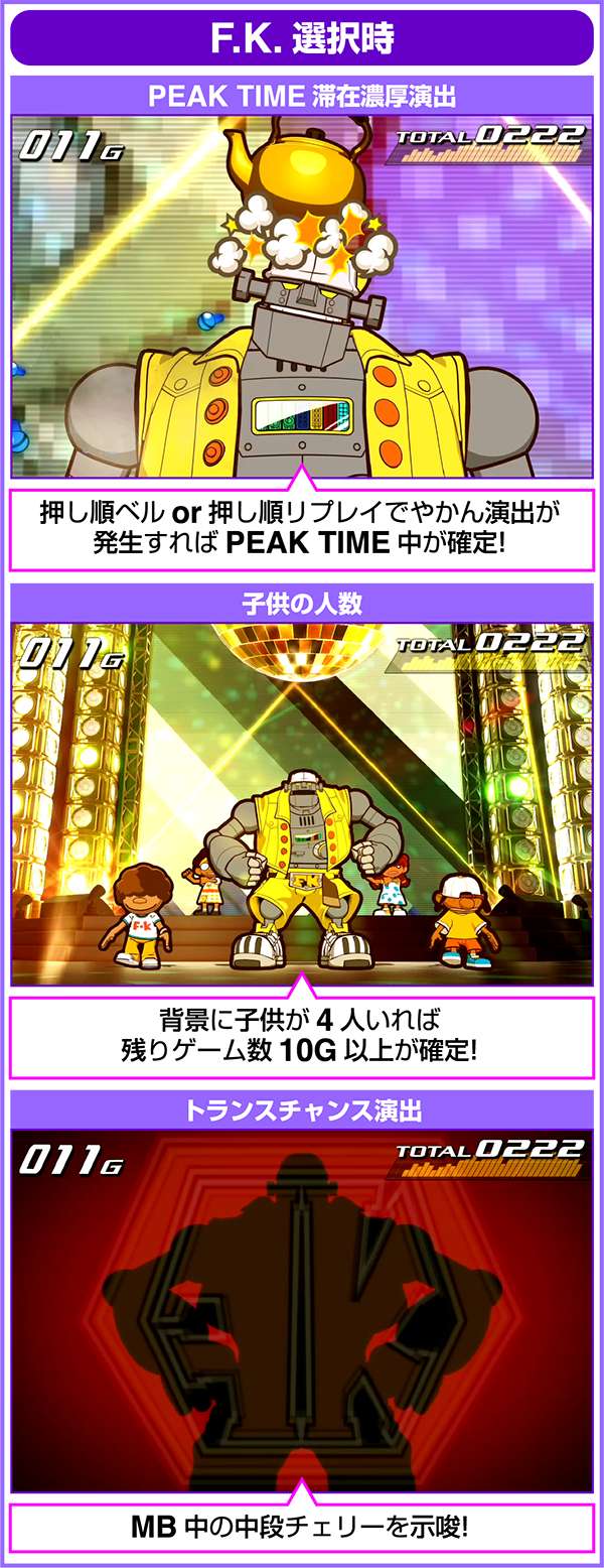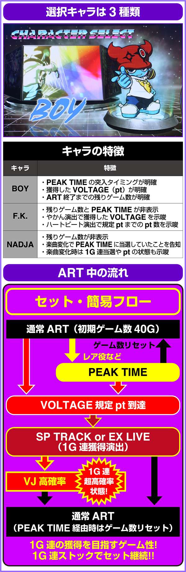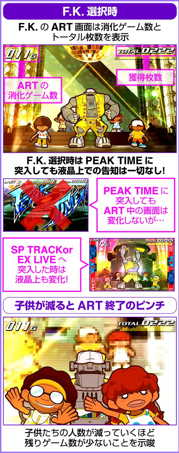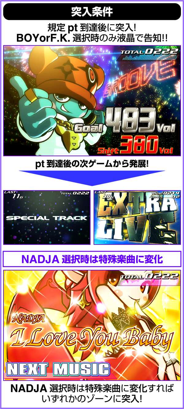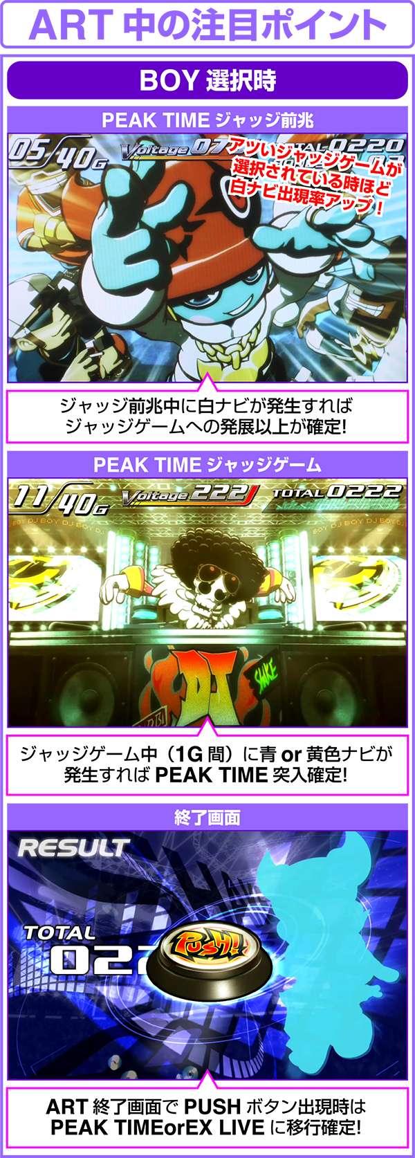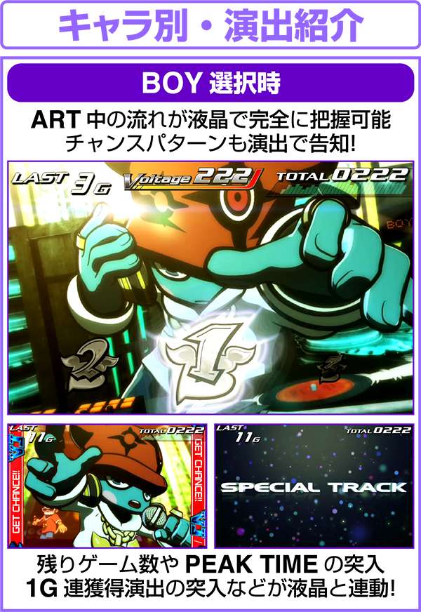 BOYを選択時は残りゲーム数から1G連までの流れまでが、すべて表示される。F.K.orNADJA選択時は残りゲーム数やPEAK TIMEなどが液晶に表示されないため、演出で推測しつつ楽しむゲーム性となっている。