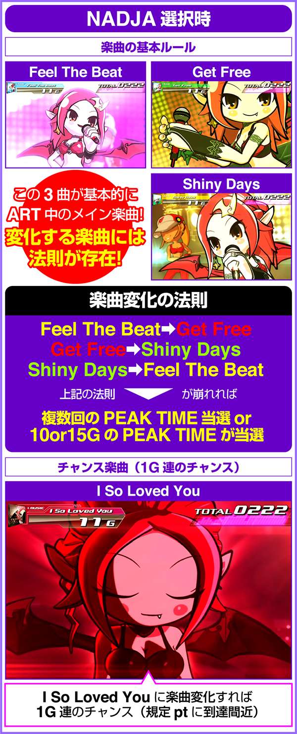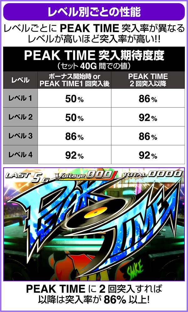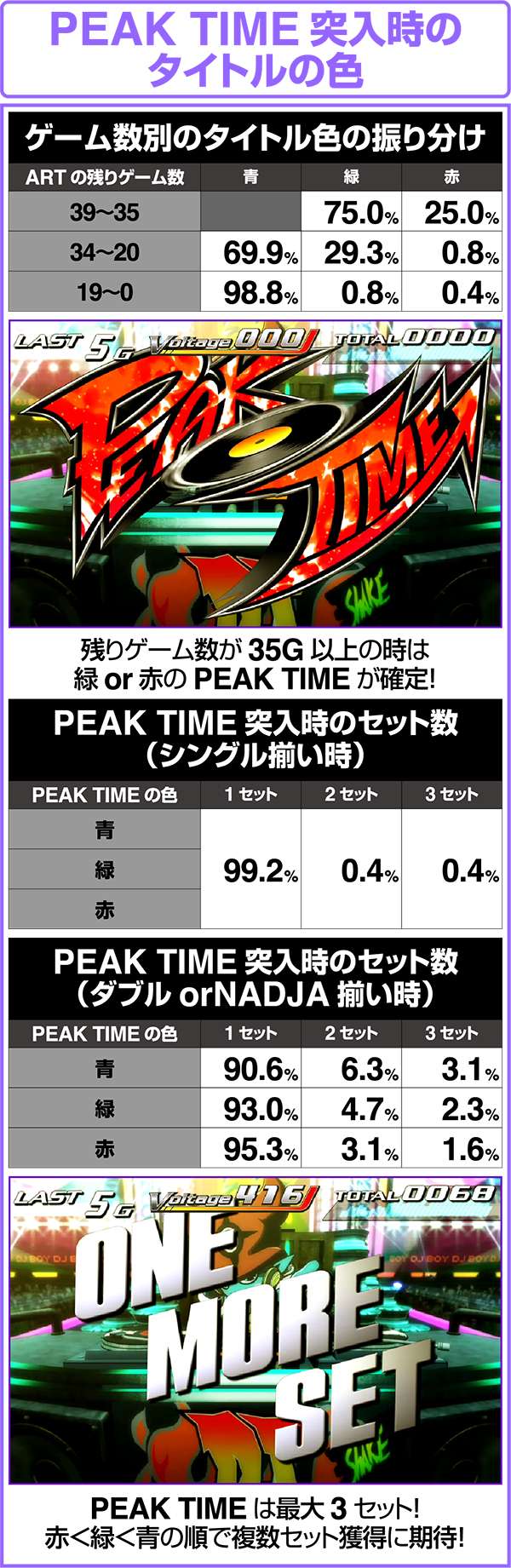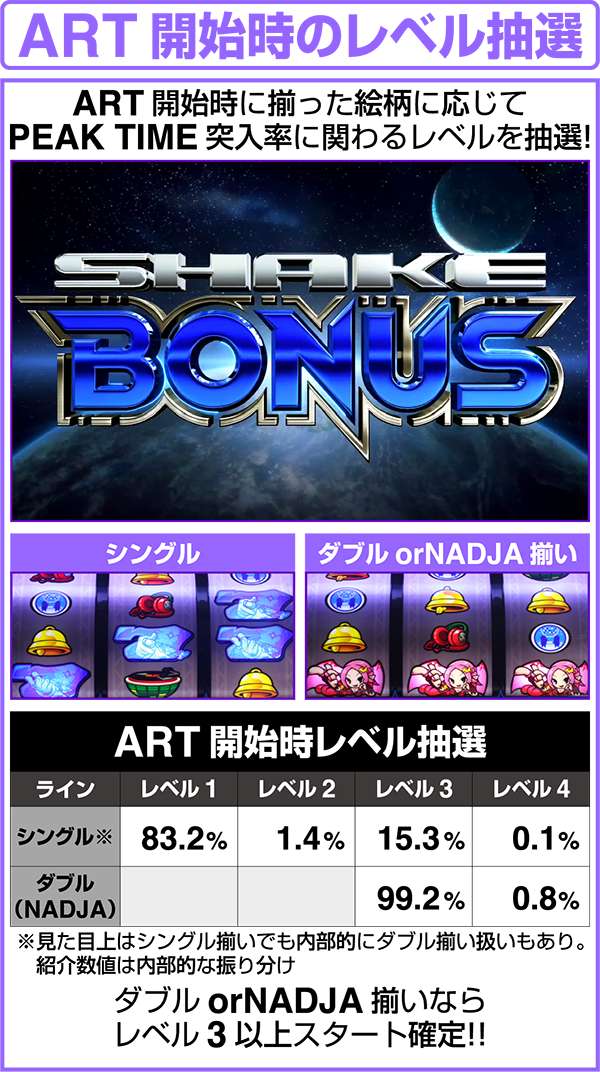 PEAK TIMEの突入率は、ART突入時のレベルに応じて決定し、レベルが高いほど40G間での突入率が高くなる。ART開始時に7のダブル揃いやNADJA揃いなら、レベルが3以上からスタートする。また、PEAK TIMEに2回突入すれば、以降の突入率は86or92%となる。