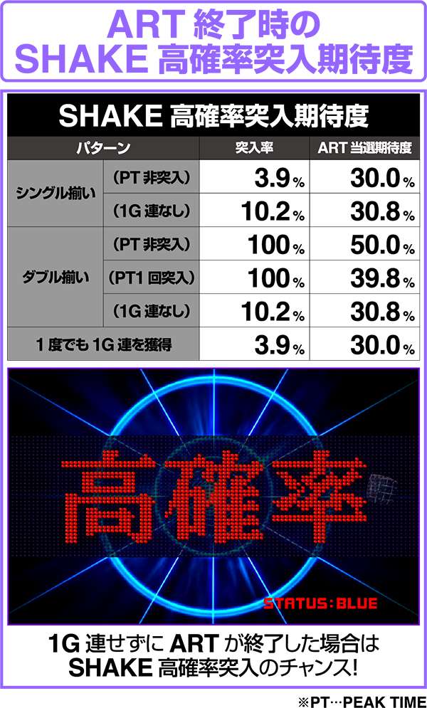 SHAKE高確率突入時はART期待度が30%以上と、引き戻しに期待が持てる。