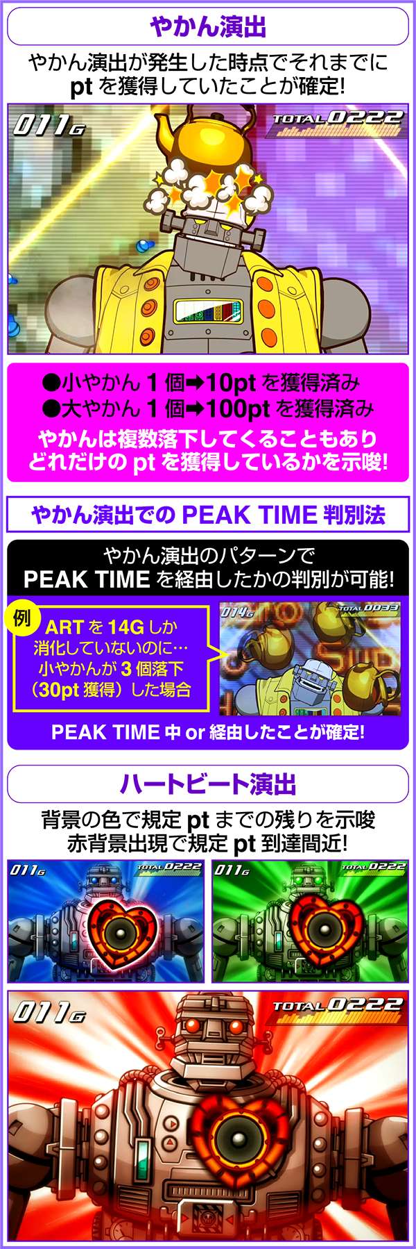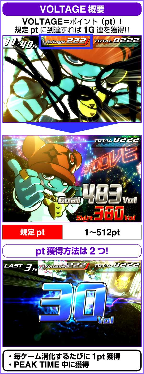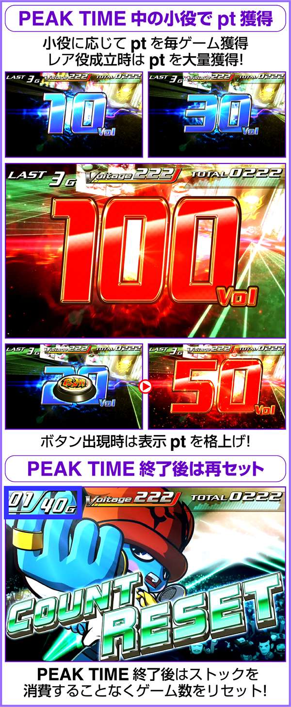 規定ptを獲得する方法は、ARTを1G消化するごとに1ptかPEAK TIME中に獲得する2パターン。また、PEAK TIME中に規定ptをオーバーした分は、次回の規定ptに持ち越しされるので、多く獲得するほど1G連およびセット継続のチャンスとなる。