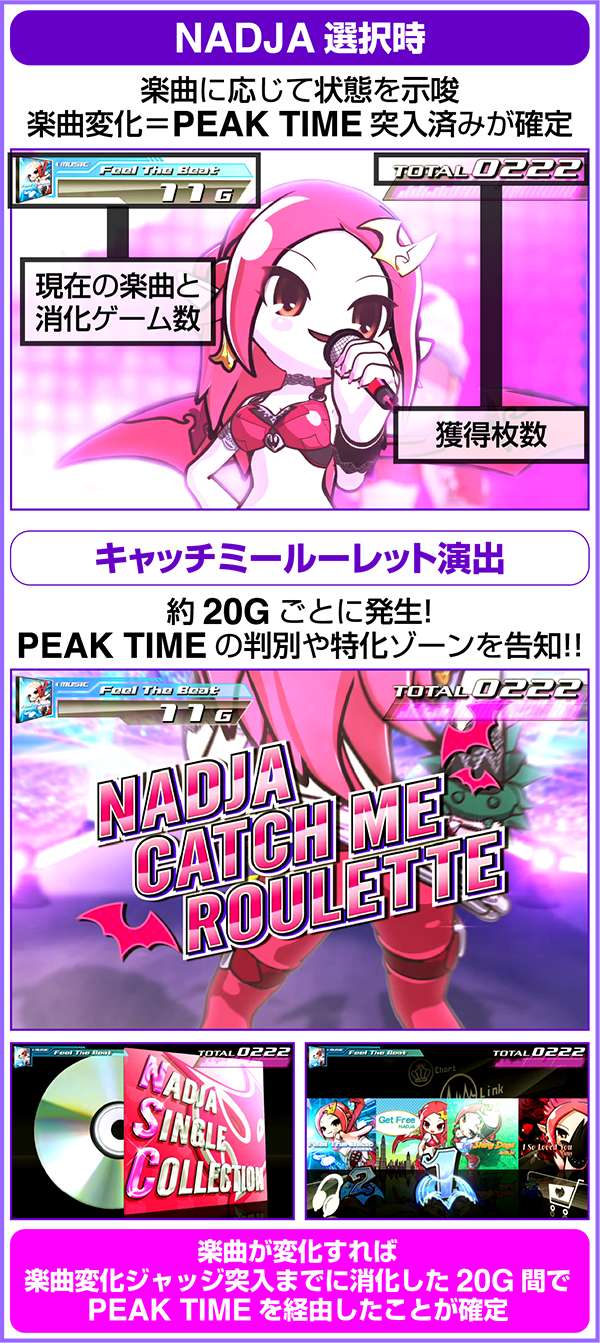 7を狙え画面出現時はNADJA絵柄も狙うことも可能。揃えばダブル揃いと同格、揃わなければシングル揃い扱いとなる。また、ボーナス確定画面における赤文字はダブル揃いが確定となる。