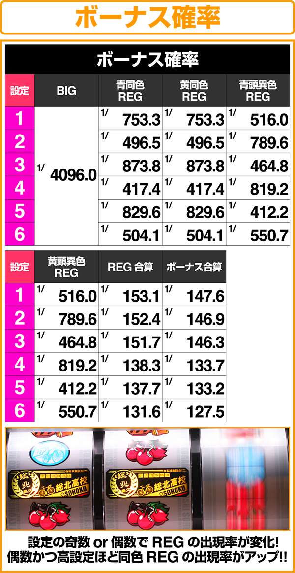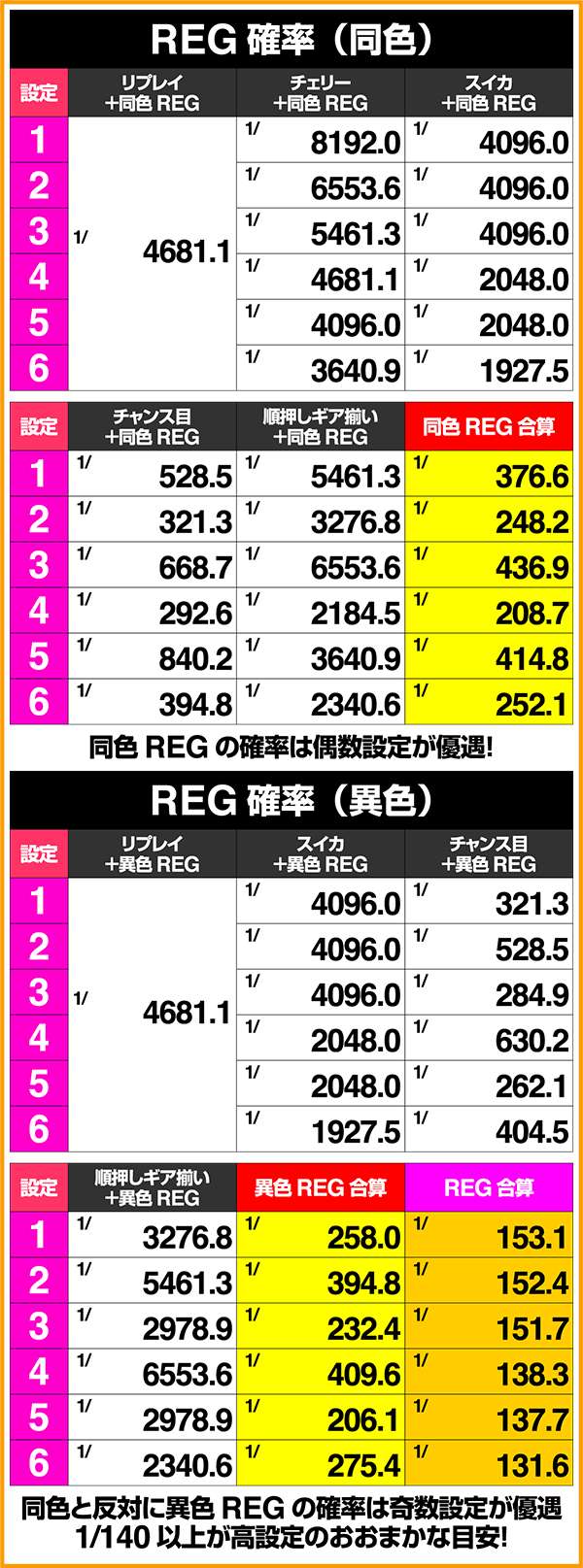 REGの出現率は奇数かつ高設定ほど異色が出現しやすく、偶数かつ高設定ほど同色が出現しやすい。