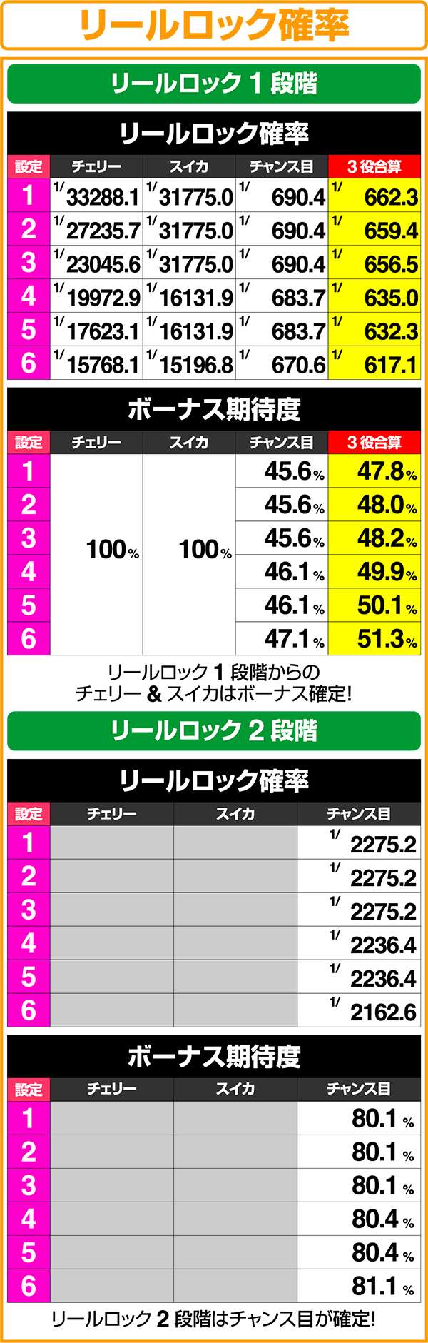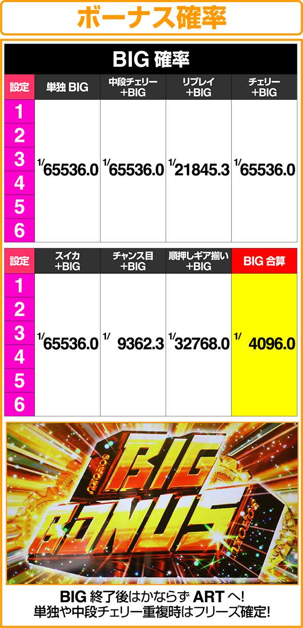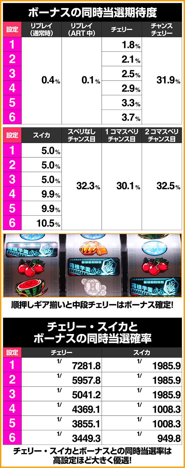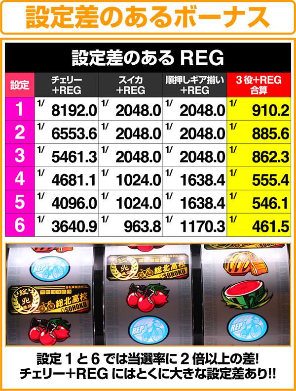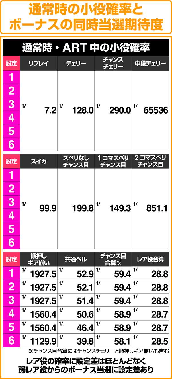 チェリーとスイカとのボーナスの同時当選に設定差があり、高設定ほど優遇されている。どちらも設定1と6では約2倍の差があるため、遊技中にチェックしておきたいポイントのひとつだ。