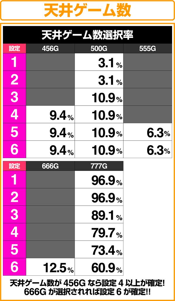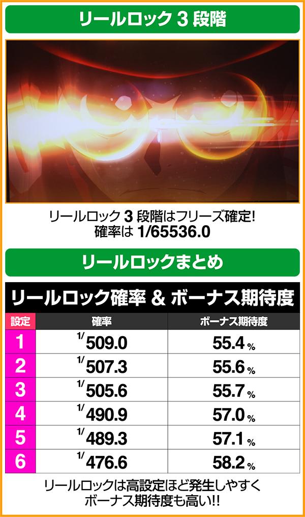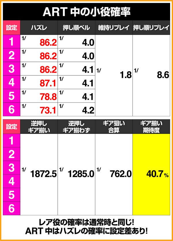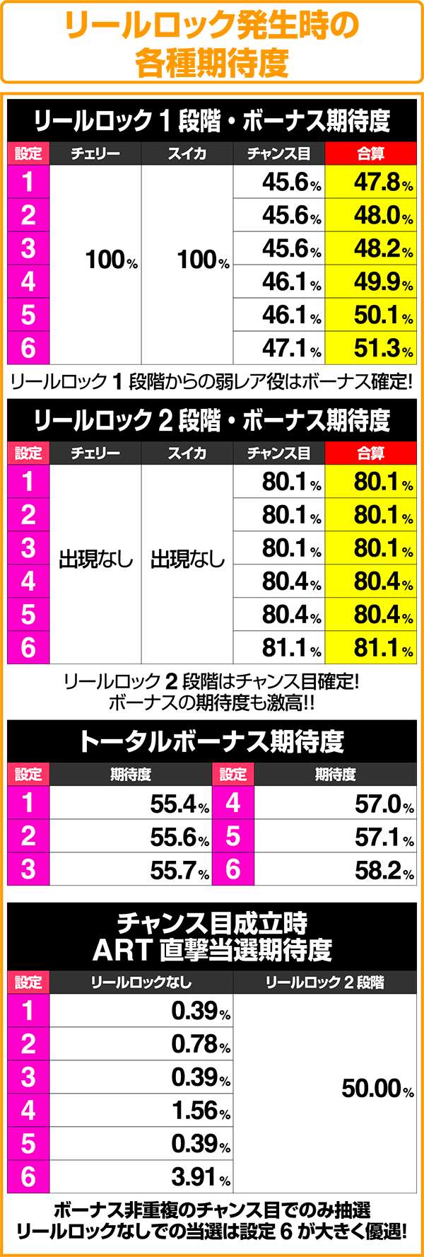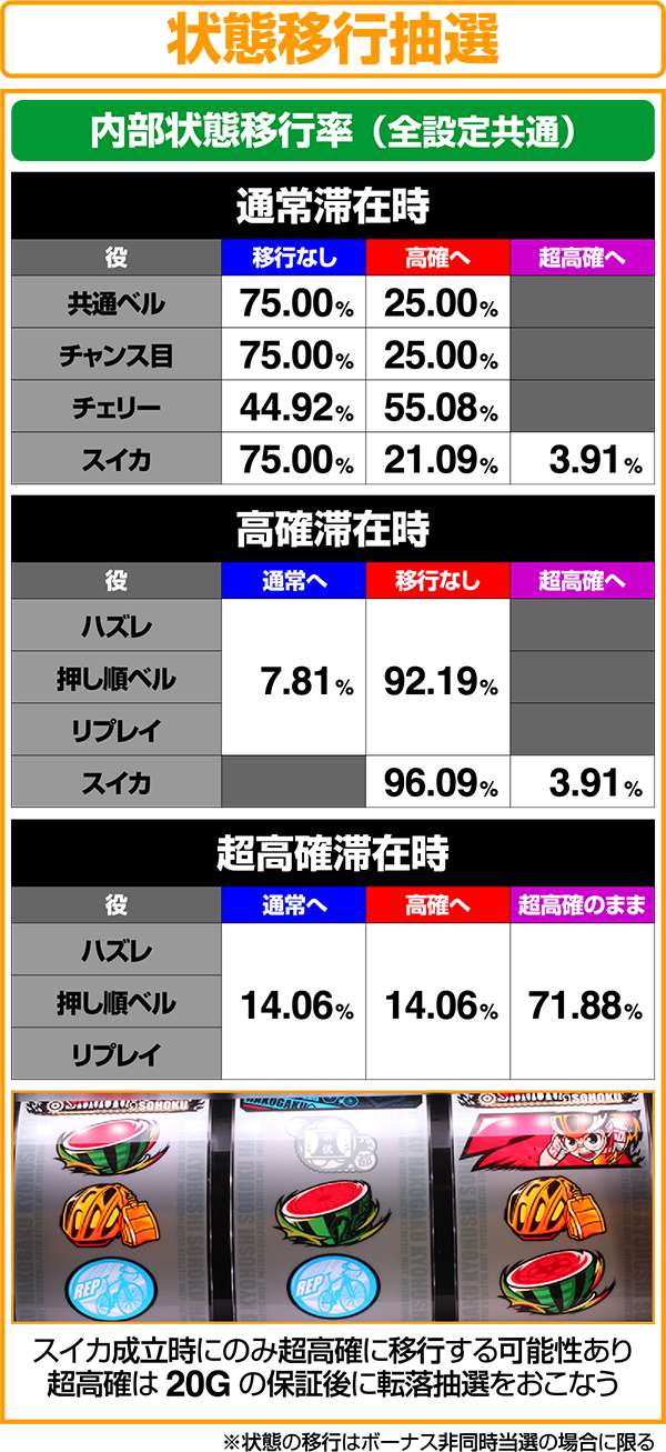 チェリーとスイカとのボーナスの同時当選に設定差があり、高設定ほど優遇されている。どちらも設定1と6では約2倍の差があるため、遊技中にチェックしておきたいポイントのひとつだ。