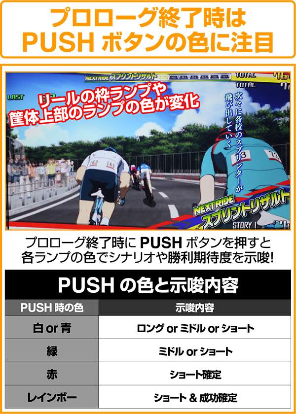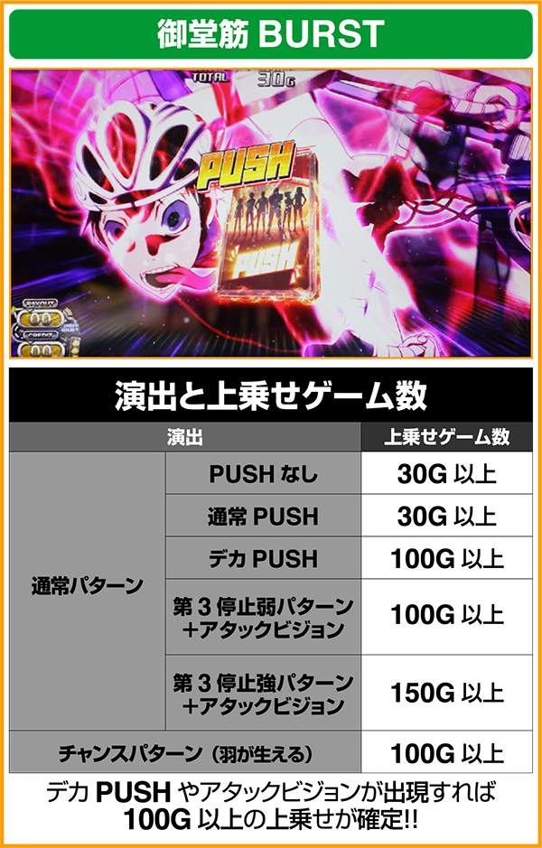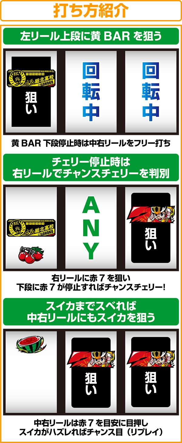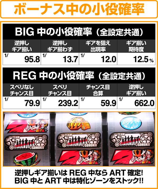 逆押しカットインはボーナス中とART中に発生。 ギアが揃い時はボーナス中・ART中共通で総北ATTACKor御堂筋BURSTをストックする。