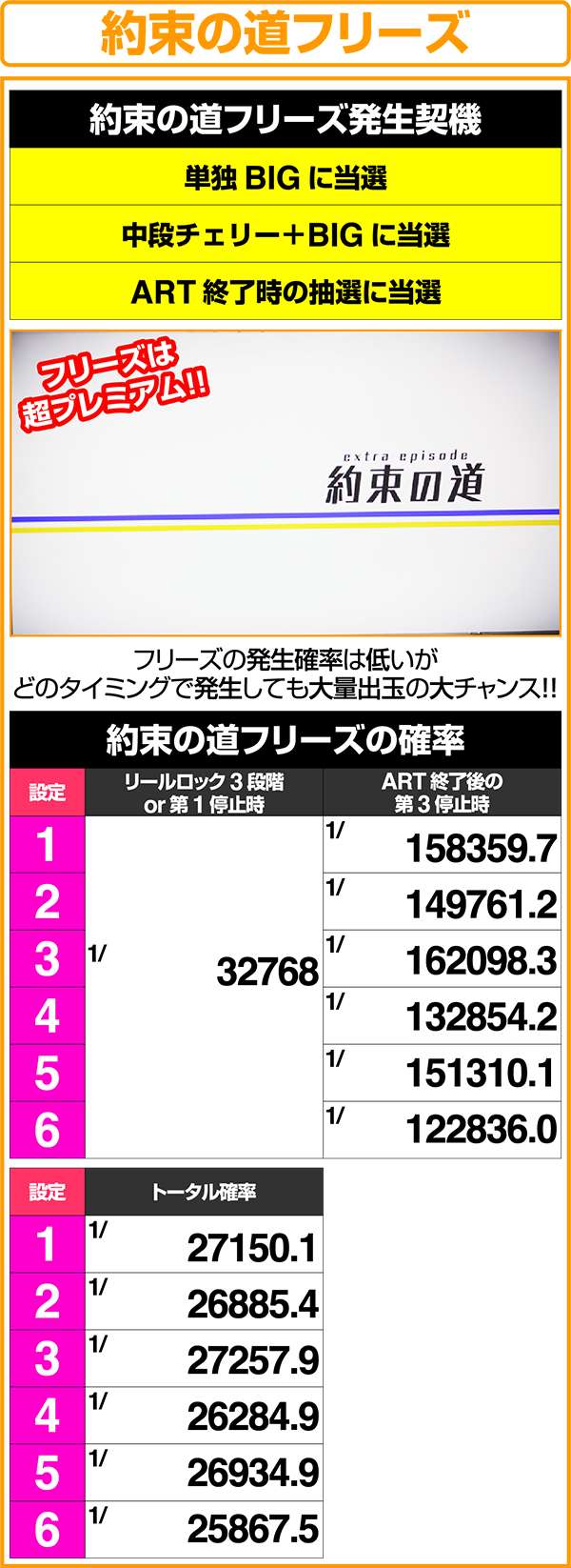 単独BIGや中段チェリー+BIG当選時が約束の道フリーズの発生契機となる。通常時に発生すればエピソードRIDE全勝が確定、ART中ならば発生以降7回分のエピソードRIDEの勝利が確定する。