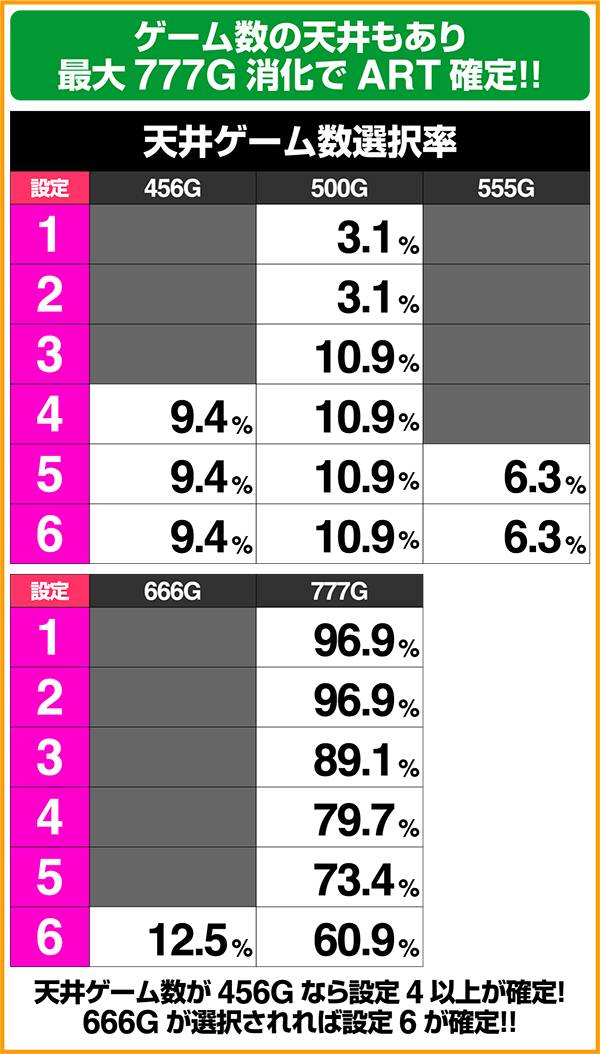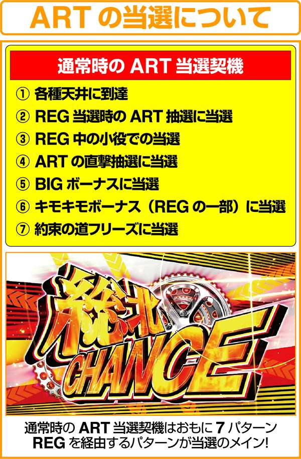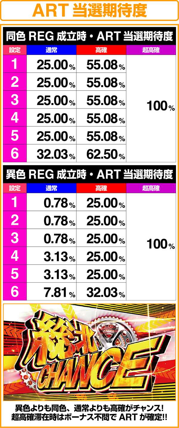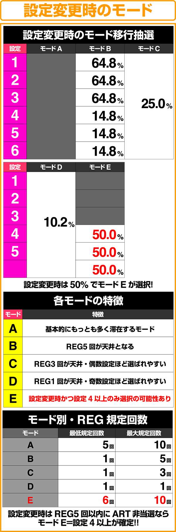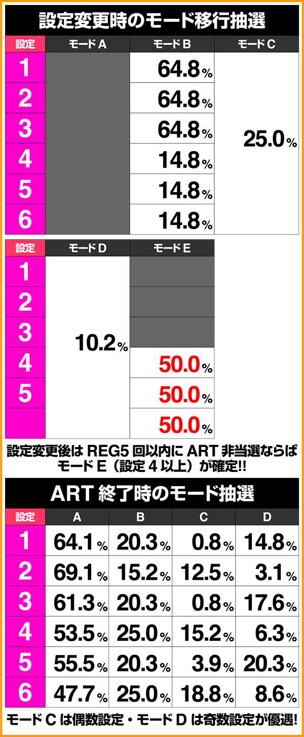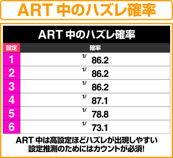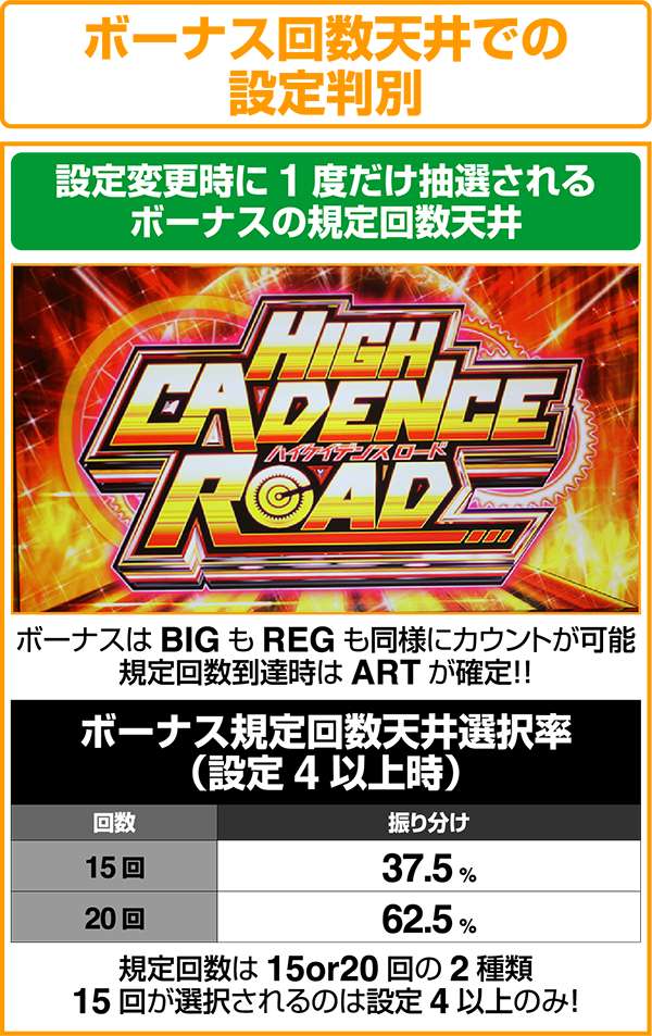 要するに、設定変更後は15or20回目のボーナスでかならずARTに当選するということ。さらに15回目だった場合は設定4以上も確定する。 ただし、REG当選時の抽選と見分けることはできないため、仮に15回目のボーナスでARTに当選したからといって設定4以上が確定するわけではない。 ちなみに、ART中に天井に到達した場合は成功確定のエピソードRIDEをストックする。