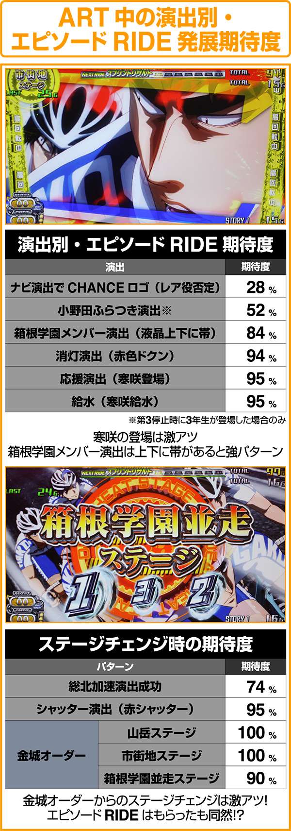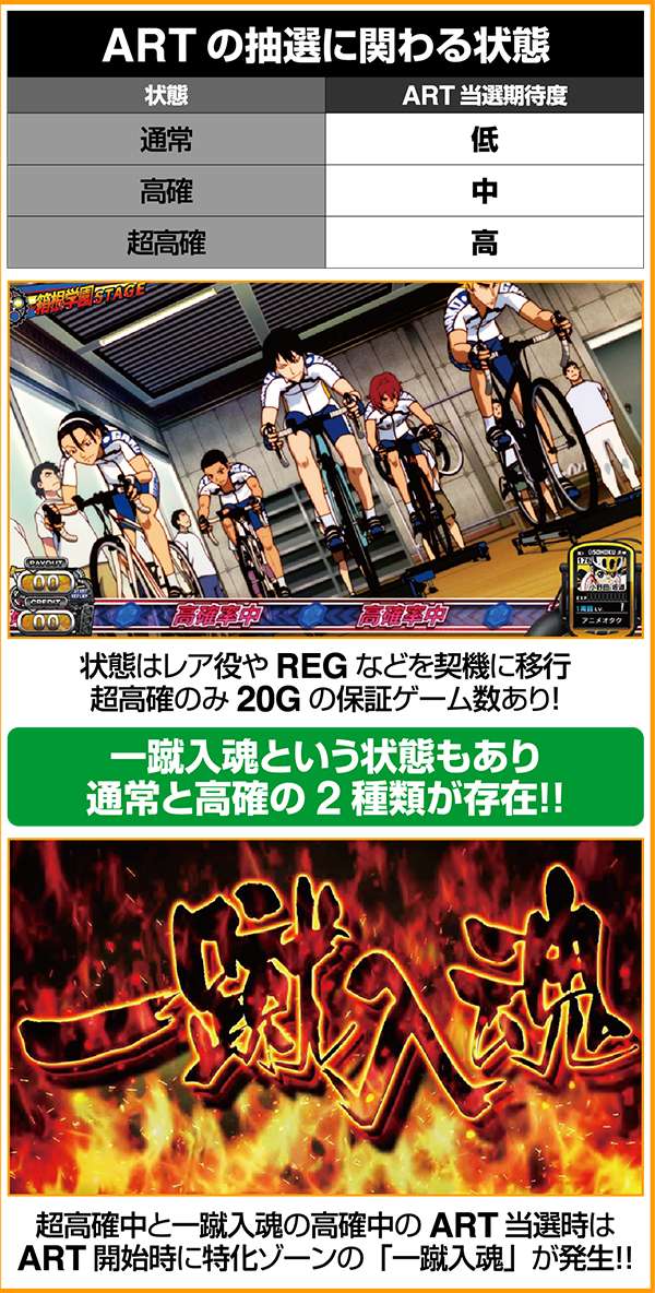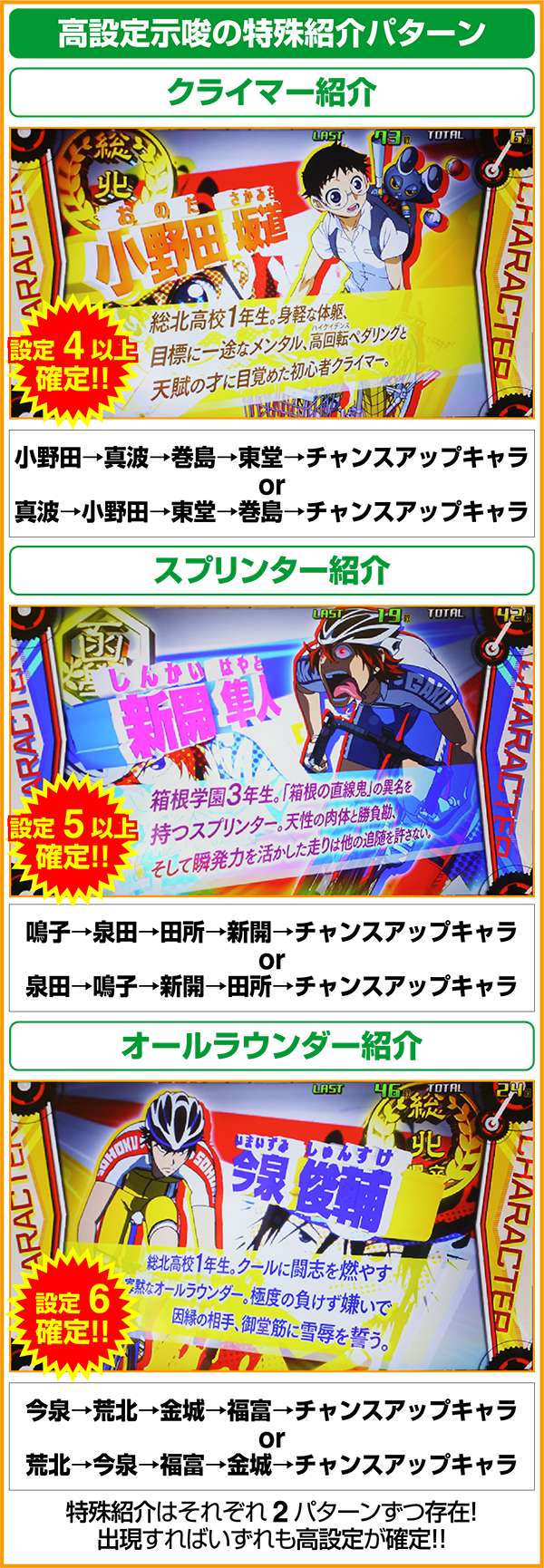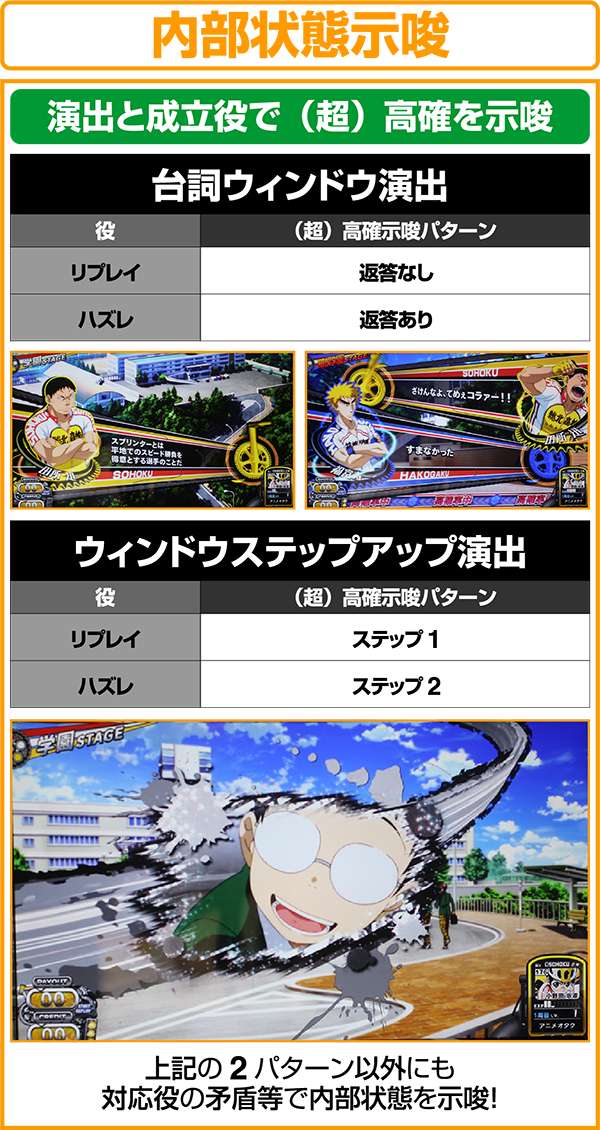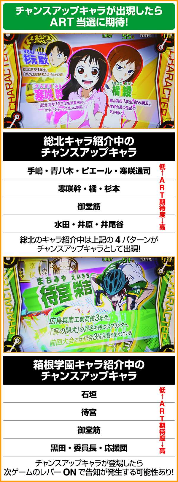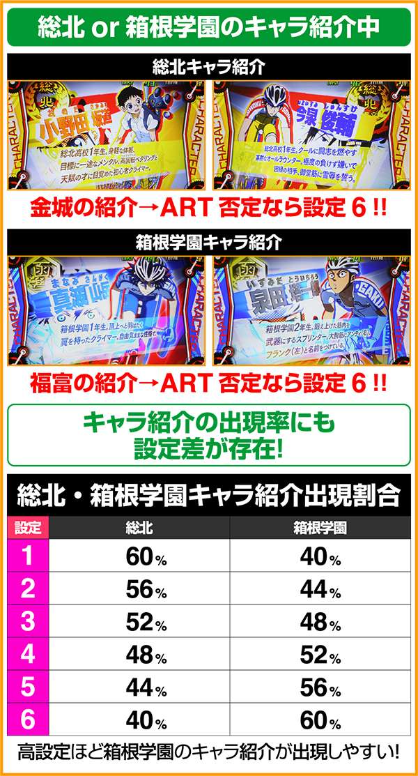 総北のキャラ紹介中に箱根学園のチャンスアップキャラ、箱根学園のキャラ紹介中に総北のチャンスアップキャラが出現するとART+一蹴入魂が確定となる。