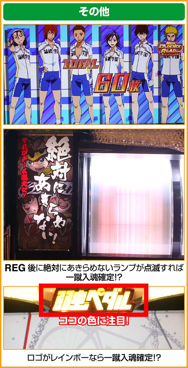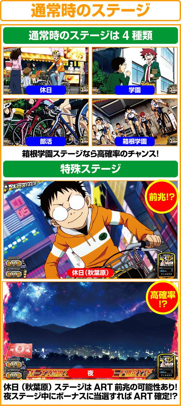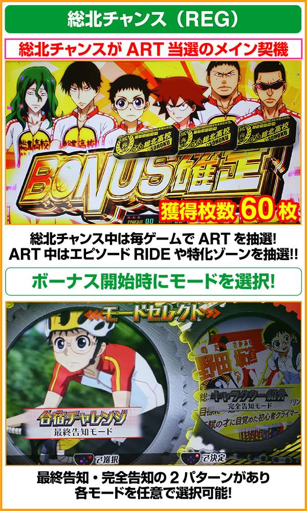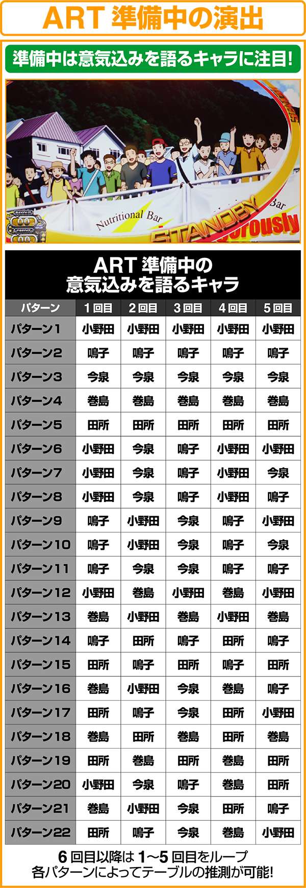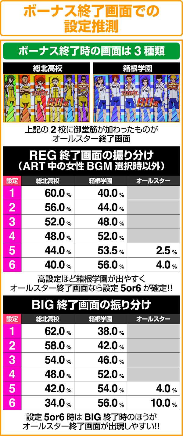総北のキャラ紹介中に箱根学園のチャンスアップキャラ、箱根学園のキャラ紹介中に総北のチャンスアップキャラが出現するとART+一蹴入魂が確定となる。