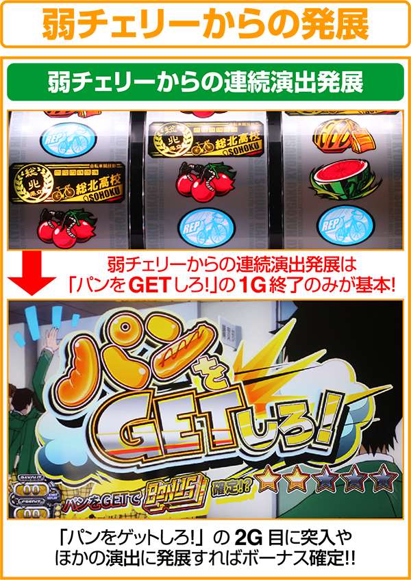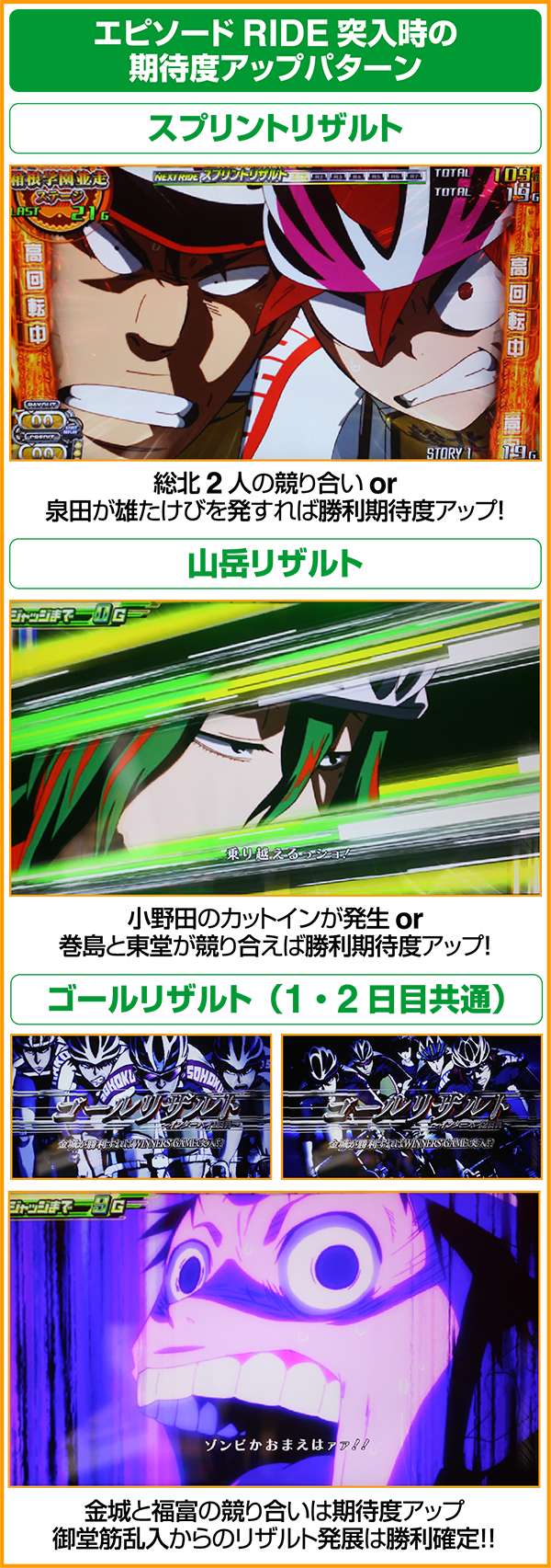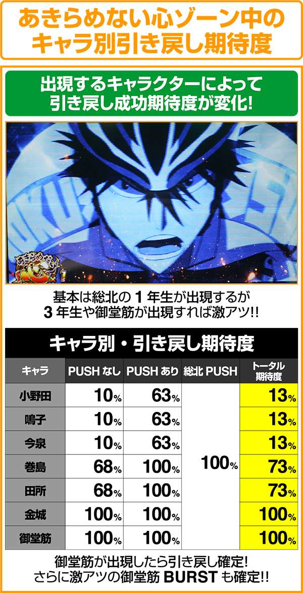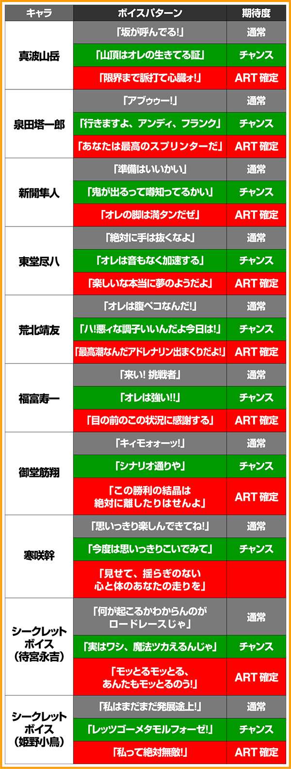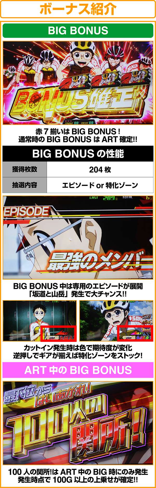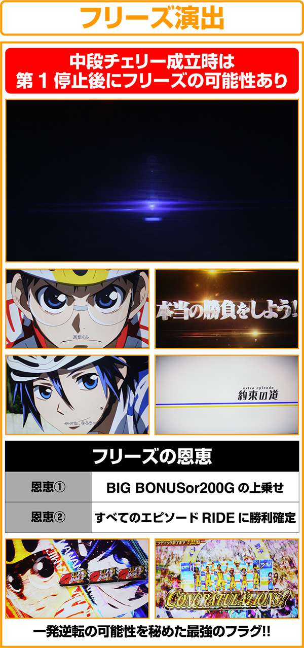 総北のキャラ紹介中に箱根学園のチャンスアップキャラ、箱根学園のキャラ紹介中に総北のチャンスアップキャラが出現するとART+一蹴入魂が確定となる。