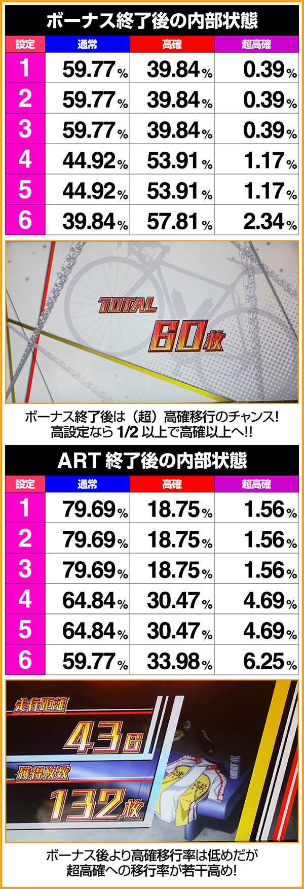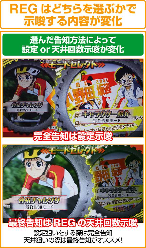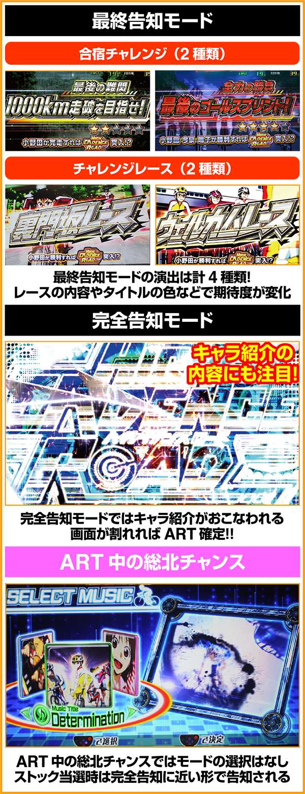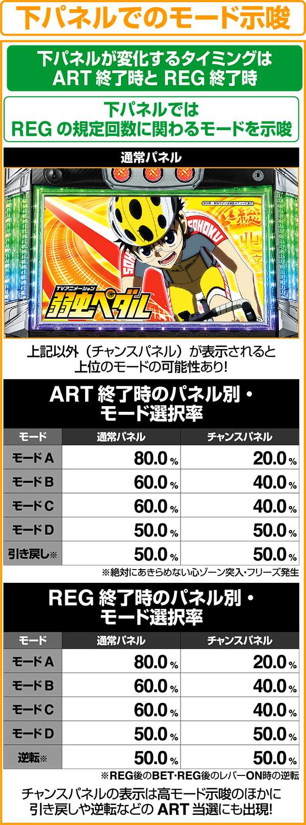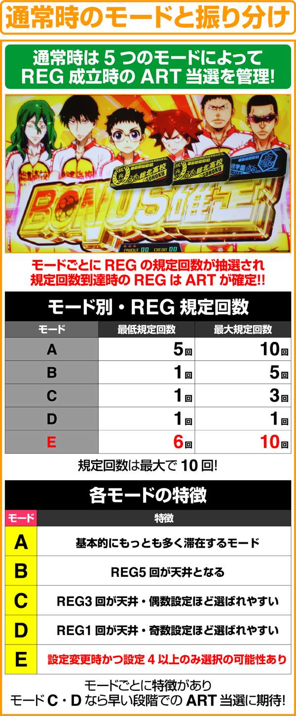 設定変更時はモードAが選択されないため、早いARTの初当りに期待が持てる。設定変更が確定しているならば積極的に狙ってみてもよいだろう。ちなみに、5回目の総北チャンス(REG)までにARTに当選しなければモードE(設定4以上)が確定する。