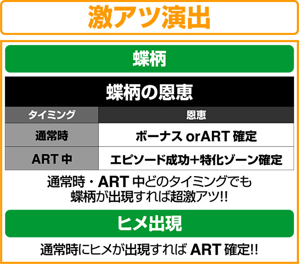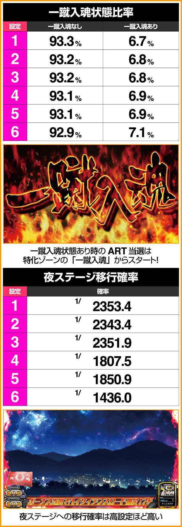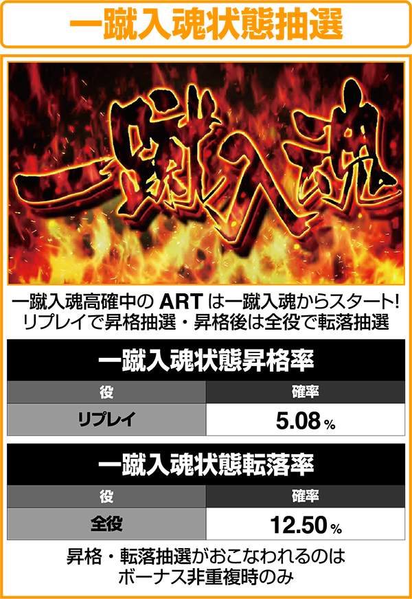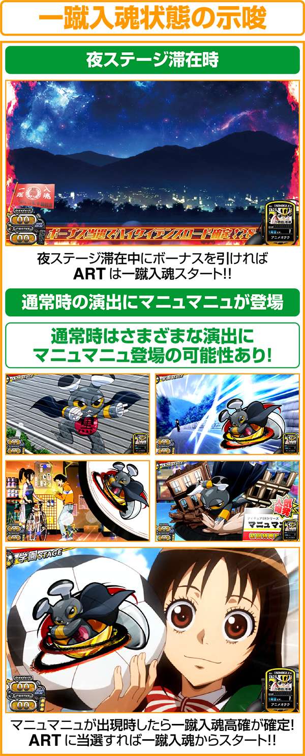 夜ステージに滞在している時にボーナスを引ければART+一蹴入魂が確定する。 また、マニュマニュは通常時の演出中に出現する可能性があり、出現したら一蹴入魂高確であることが確定するため、ARTに当選できれば一蹴入魂からのスタートとなる。