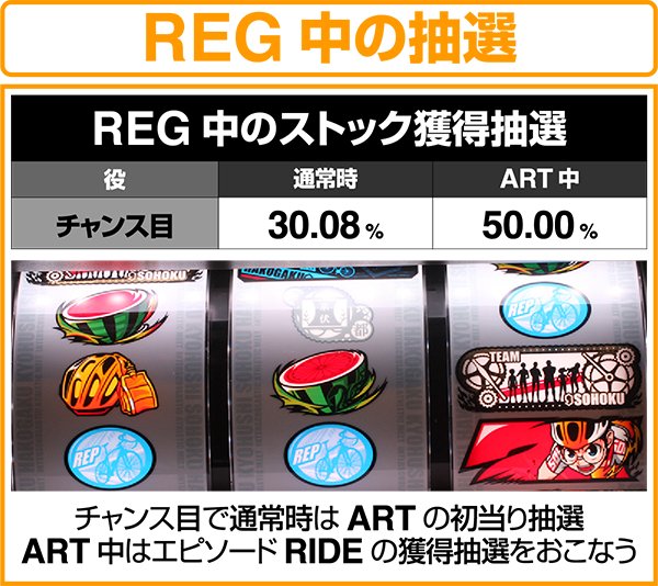 REG成立時の抽選でARTの当選、非当選は決定されるが、非当選の場合は消化中のチャンス目で書き換え抽選をおこなう。当選後はART中のREGと同様に、エピソードRIDEのストック獲得抽選をおこなう。