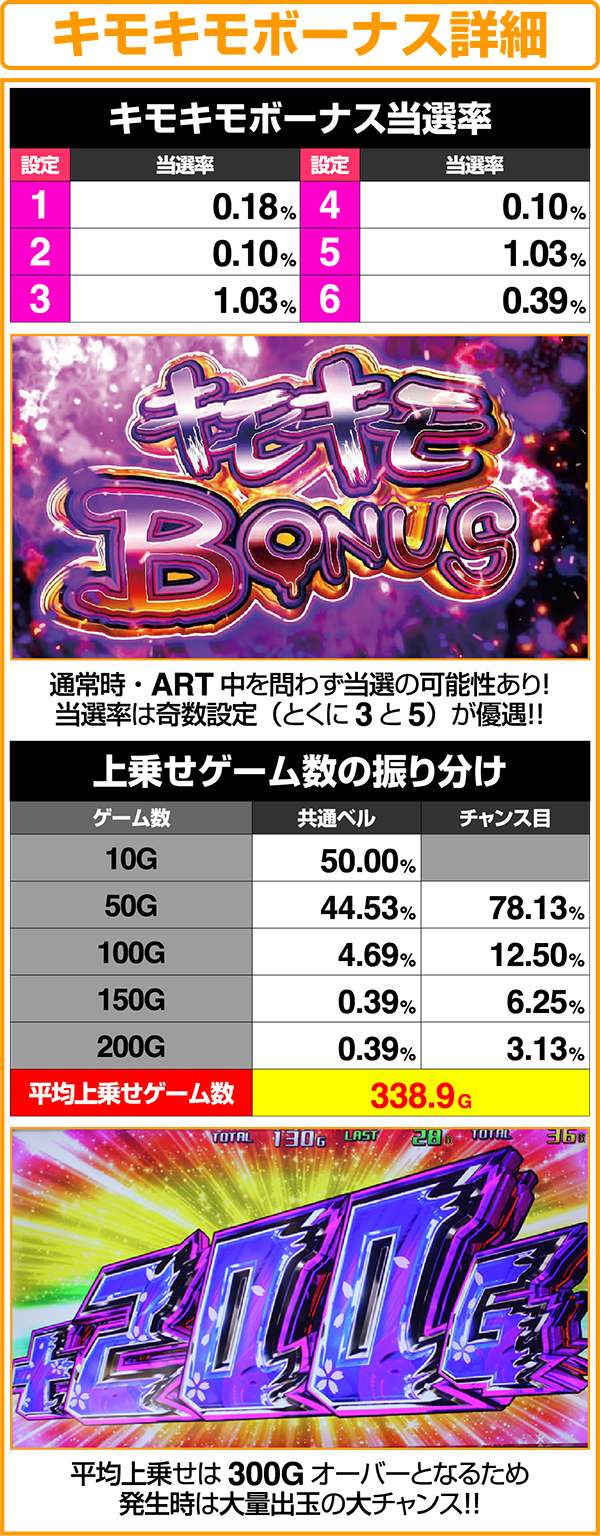 キモキモボーナスの当選率と上乗せゲーム数の振り分け