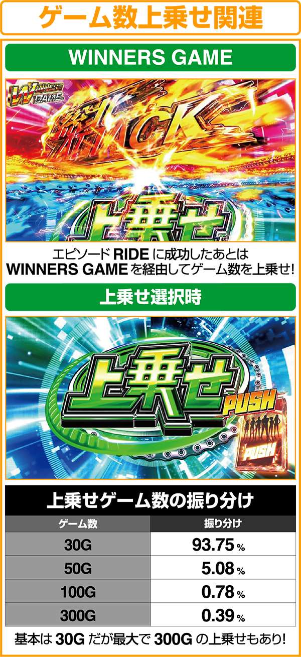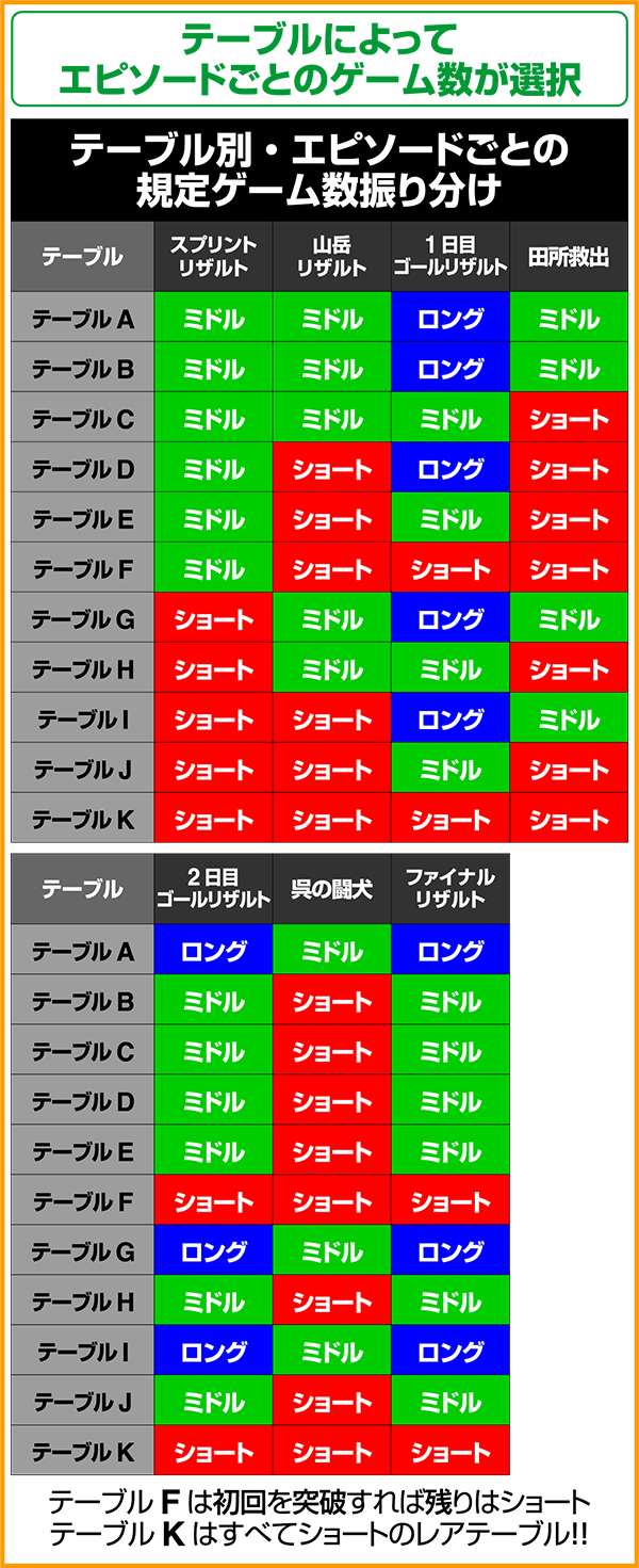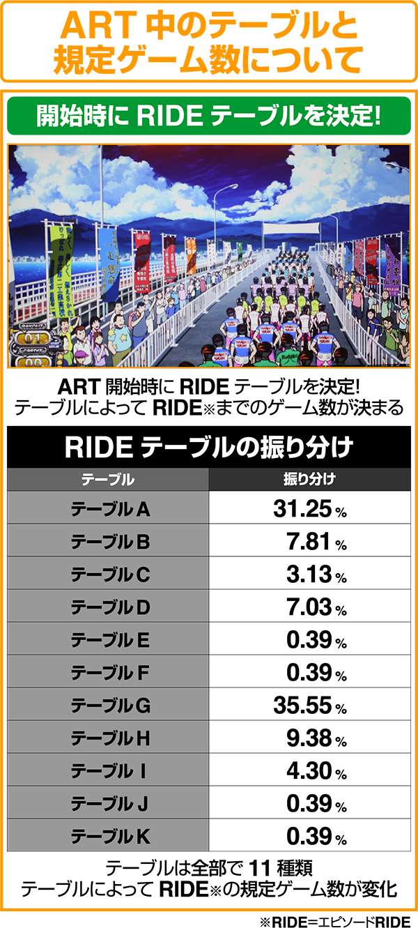 RIDEテーブルはA〜Kの11種類。おおまかにではあるが、エピソードRIDEの当選ゲーム数から選択されているテーブルを予測できるところも楽しいポイントといえるだろう。