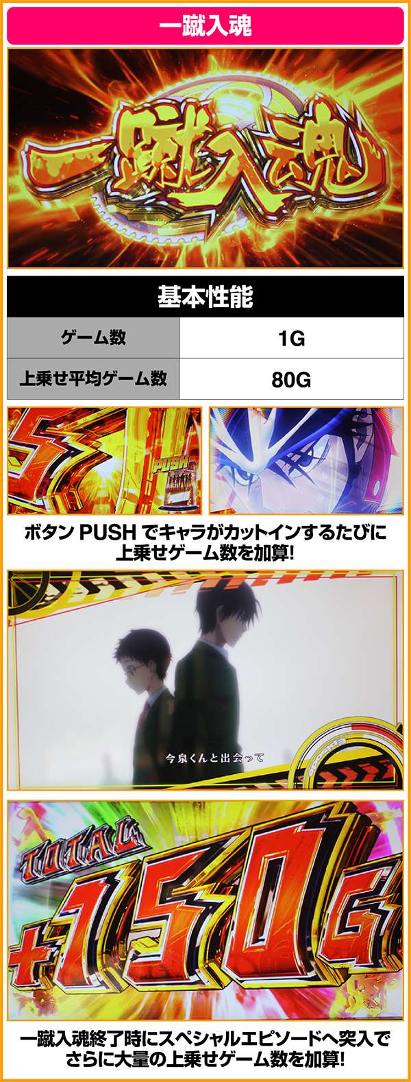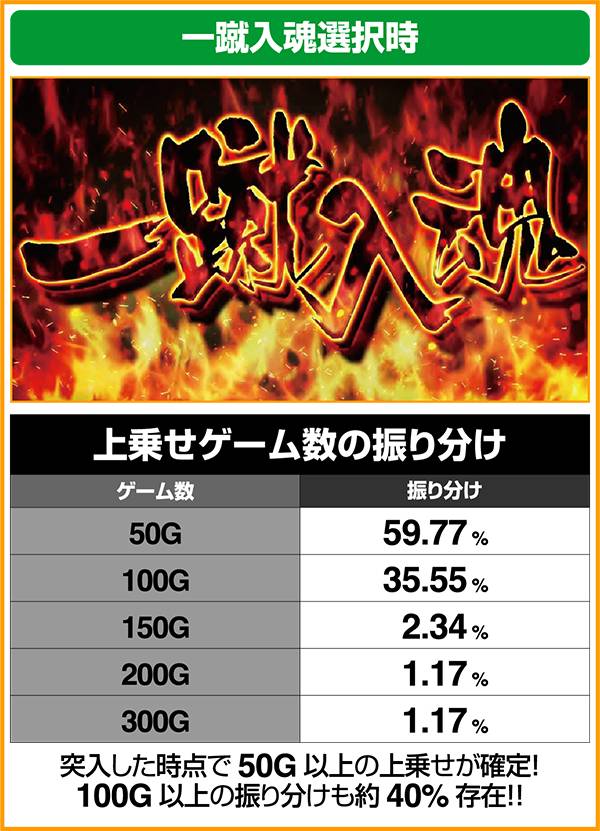 一蹴入魂は1G限定の上乗せ特化ゾーンとなっており、成立役に関わらず、一律で上乗せゲーム数が抽選される。