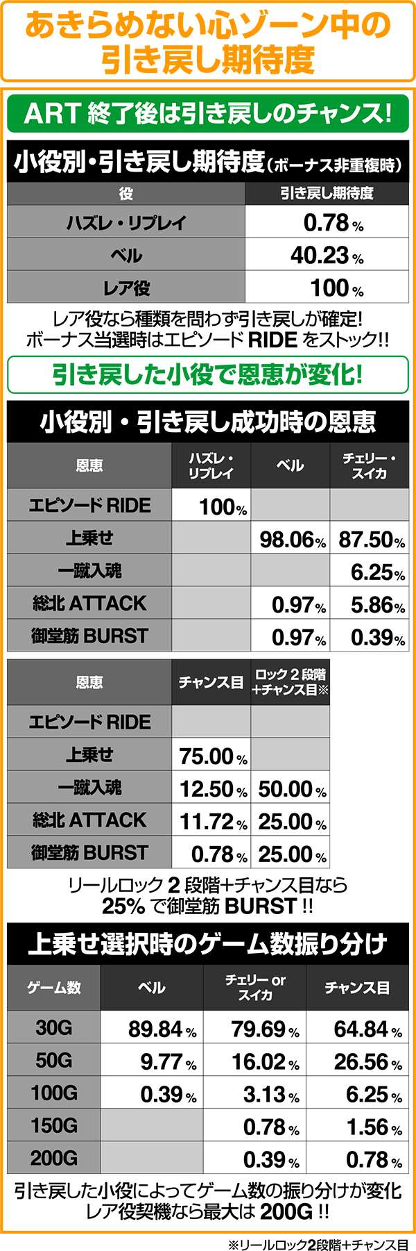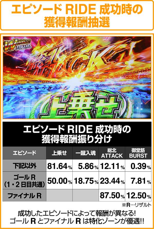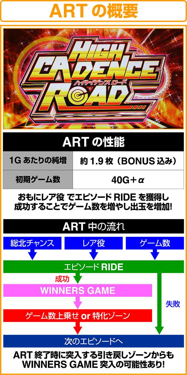 引き戻しに成功したあとは、ゲーム数を上乗せしてARTに復帰する。まれに、エピソードRIDEに突入することもあり。
