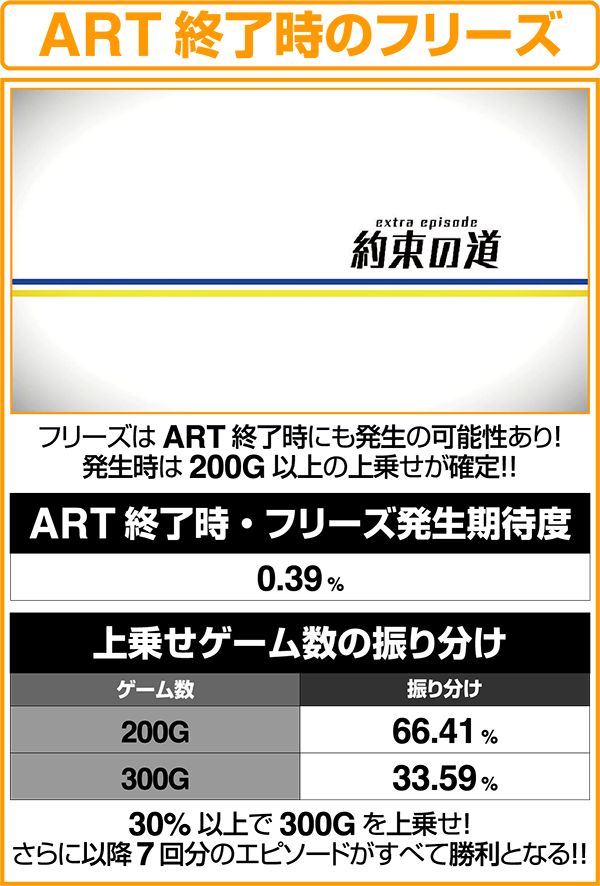 また、フリーズはART終了時にも発生する可能性があり、発生時はARTのゲーム数を200G以上上乗せし、ARTへと復帰する。この場合も発生以降7回分のエピソードRIDEの勝利が確定となる。